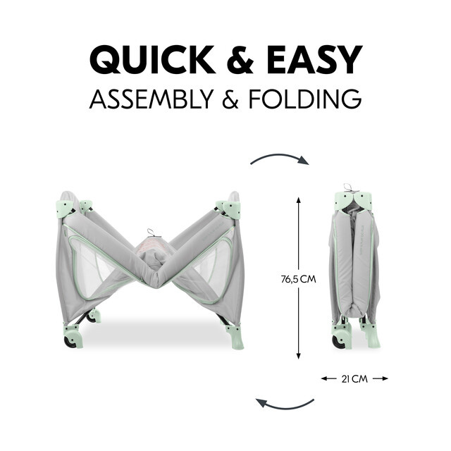 Cestovní postýlku Hauck rychle sestavíte a opět složíte v několika jednoduchých krocích. Přiložená skládací matrace je vyplněna PU pěnou a slouží jako odkládací plocha a stabilizátor.
