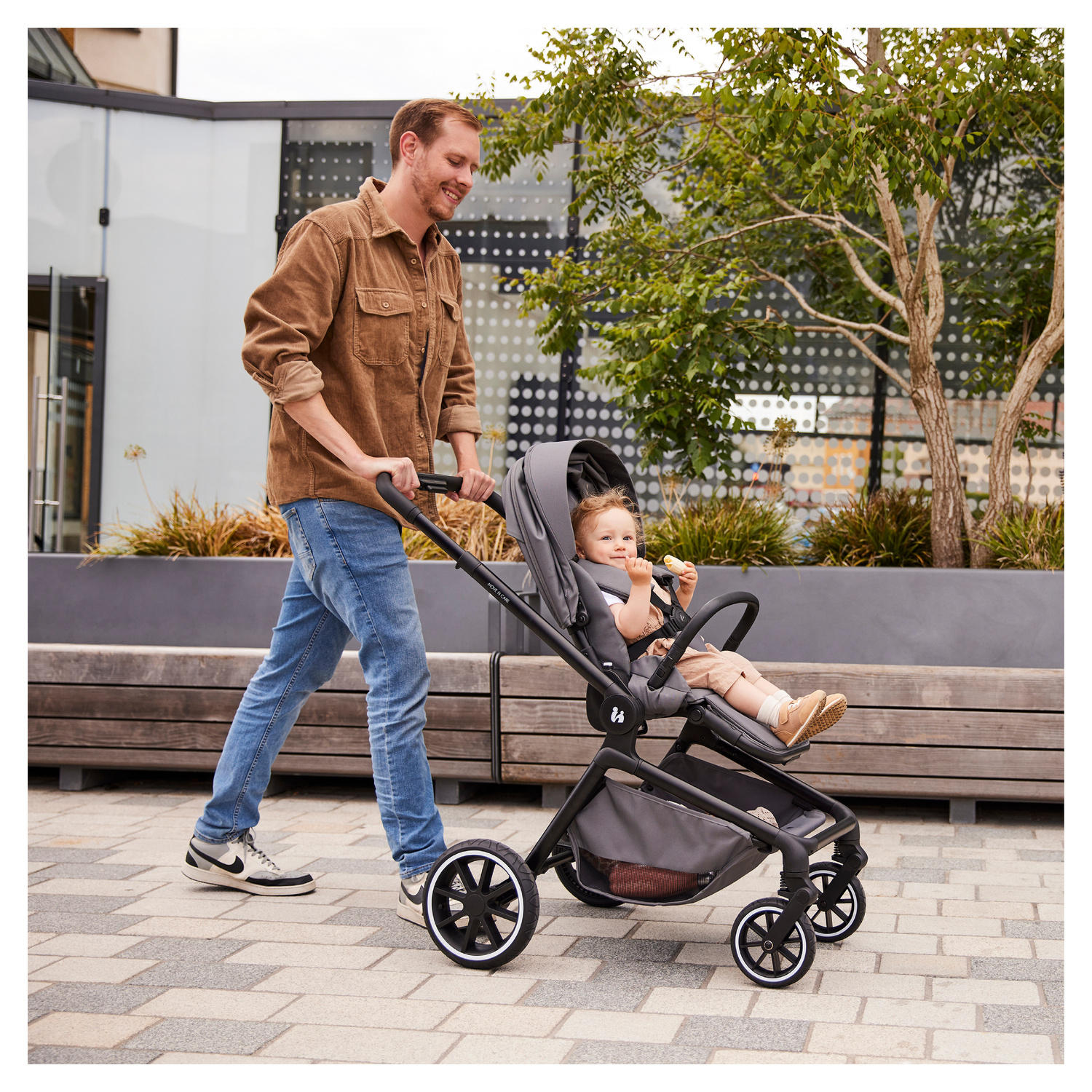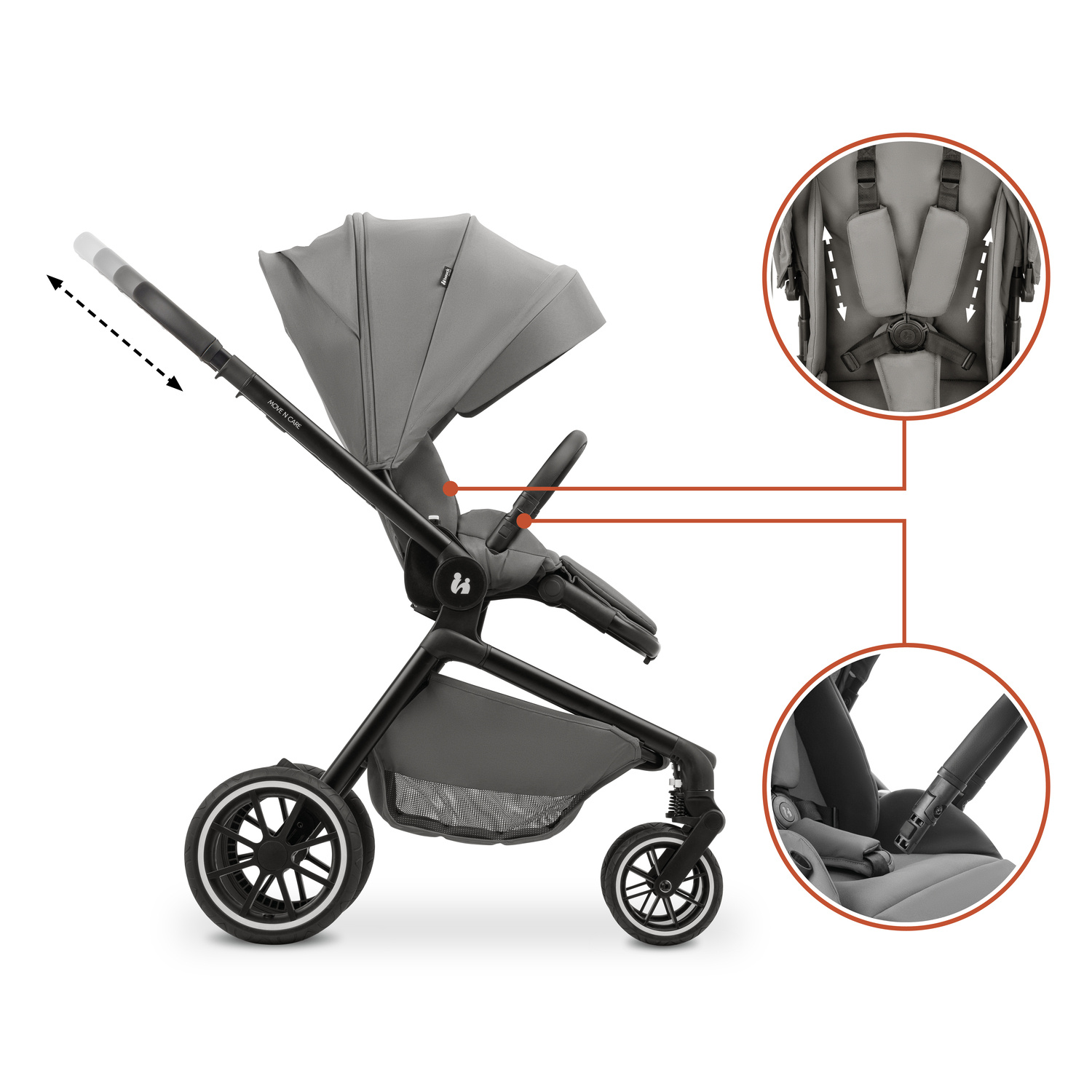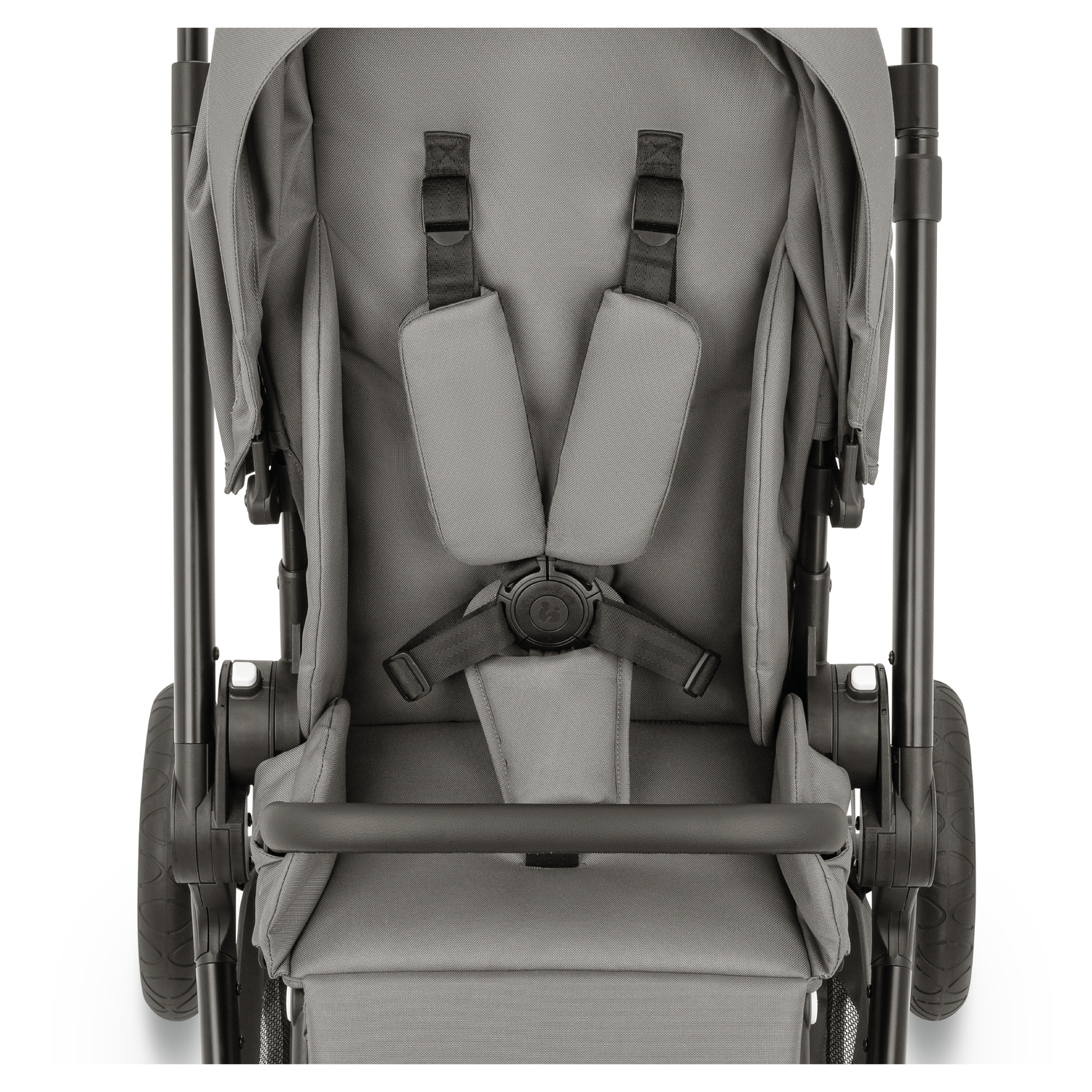 Díky gumovým kolům do každého terénu jste vybaveni na všechny cesty. Odpružení 4 x 4 jemně pohupuje vaše děťátko, zatímco prodlužovací XL sluneční stříška (UV 50+) jej chrání za každého počasí a síťovaná okénka poskytují dostatek čerstvého vzduchu. Sedátko kočárku má výškově nastavitelné 5-bodové bezpečnostní pásy a dobře polstrovanou, extra vysokou opěrku zad. Opěrka nohou roste s vaším dítětem.
