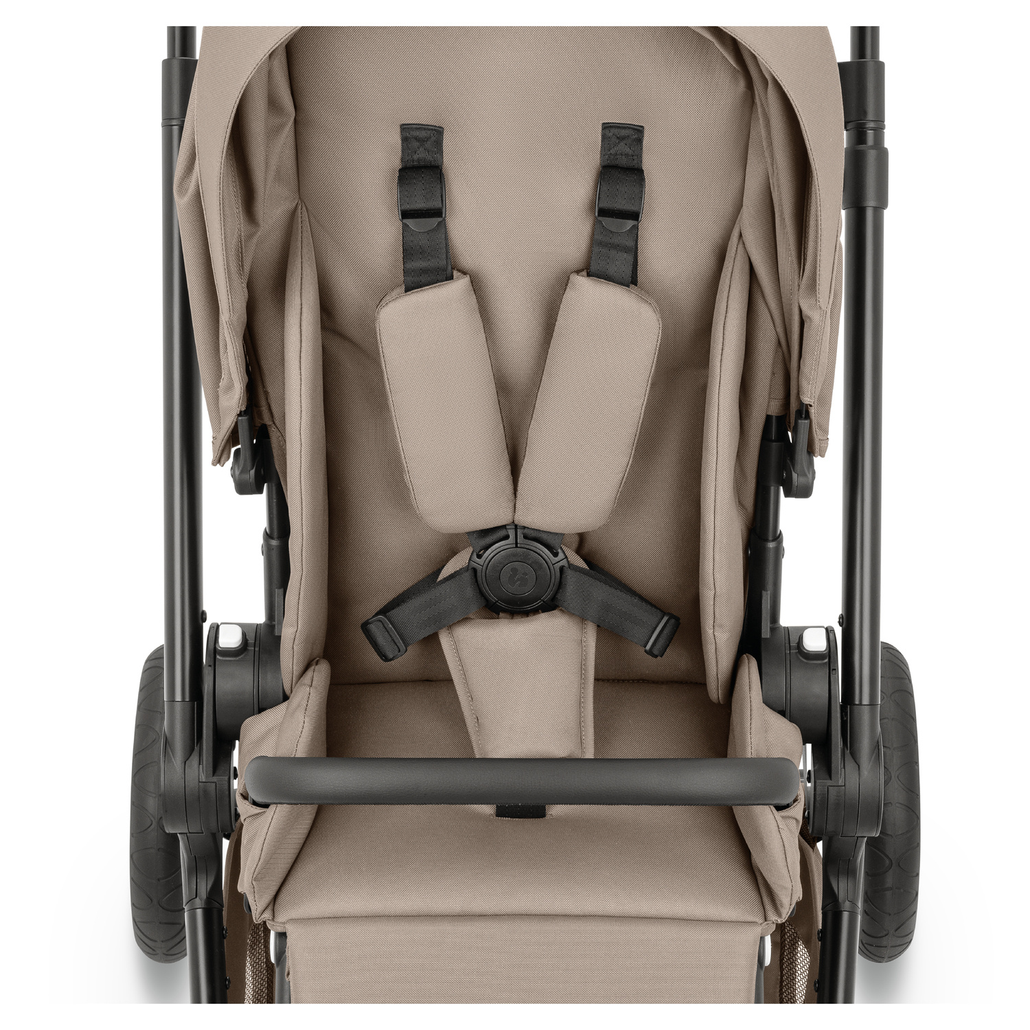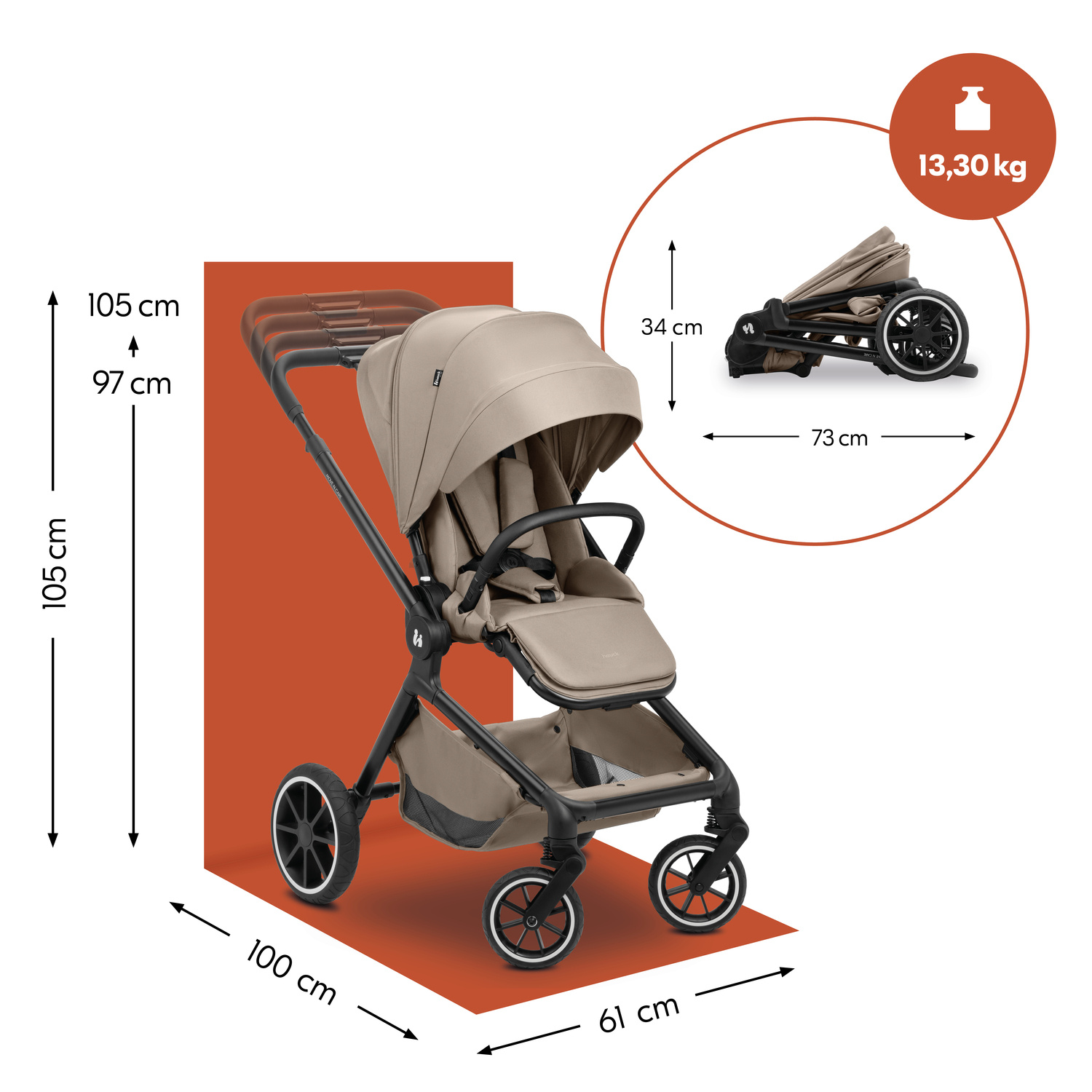 Díky gumovým kolům do každého terénu jste vybaveni na všechny cesty. Odpružení 4 x 4 jemně pohupuje vaše děťátko, zatímco prodlužovací XL sluneční stříška (UV 50+) jej chrání za každého počasí a síťovaná okénka poskytují dostatek čerstvého vzduchu. Sedátko kočárku má výškově nastavitelné 5-bodové bezpečnostní pásy a dobře polstrovanou, extra vysokou opěrku zad. Opěrka nohou roste s vaším dítětem.