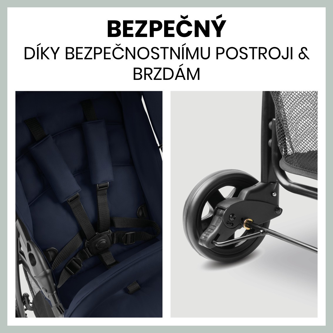 BEZPEČNOSTNÍ POSTROJ A BRZDY PRO ZAJIŠTĚNÍ BEZPEČNOSTI // Abyste si mohli v poklidu užívat svou procházku s děťátkem je kočárek vybaven pohodlným bezpečnostním postrojem a brzdou, která bezpečně zajistí kočárek, kdykoli potřebujete.