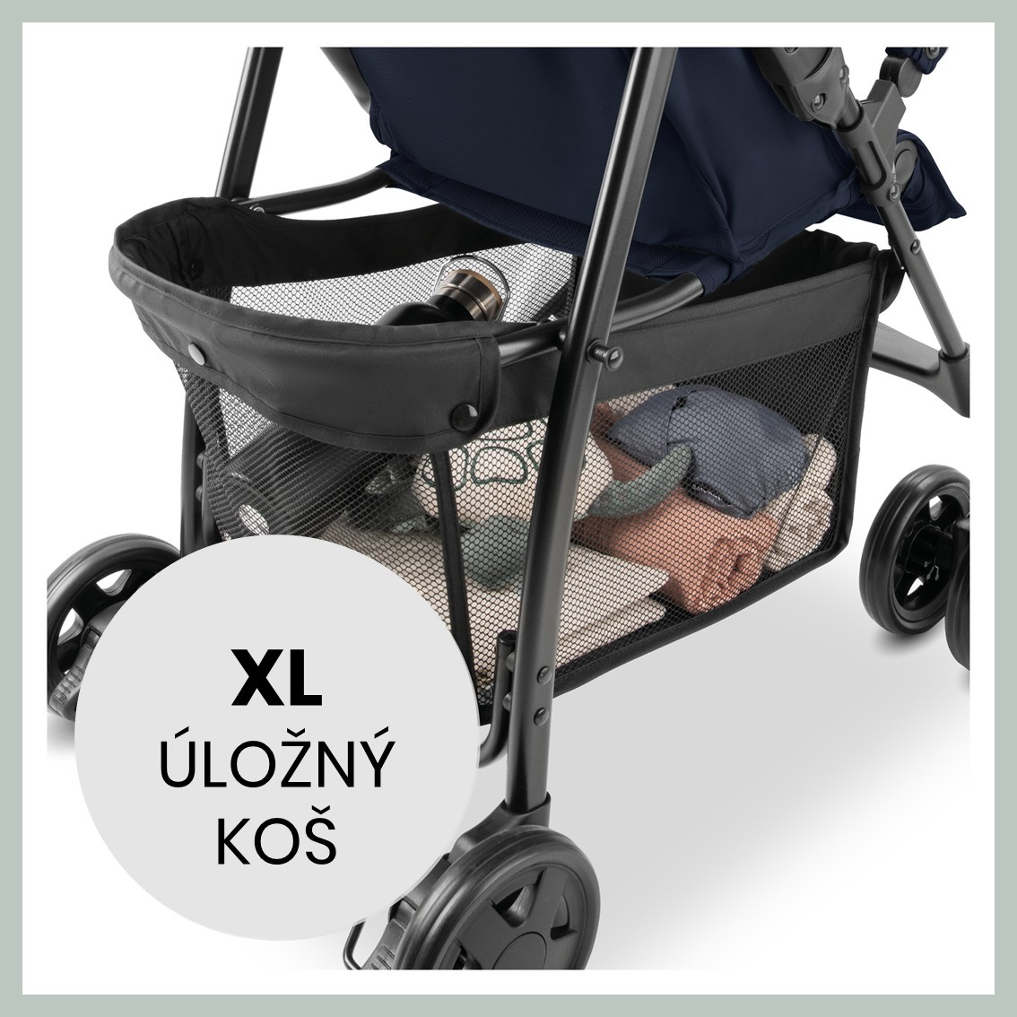 DOSTATEK ÚLOŽNÉHO PROSTORU DÍKY XL KOŠI // Hračky, tašku na plenky, svačinku, vše, co potřebujete na procházku jednoduše uložíte do prostorného XL koše, stejně tak i nákup. Prostorný úložný koš snadno pojme vše potřebné.