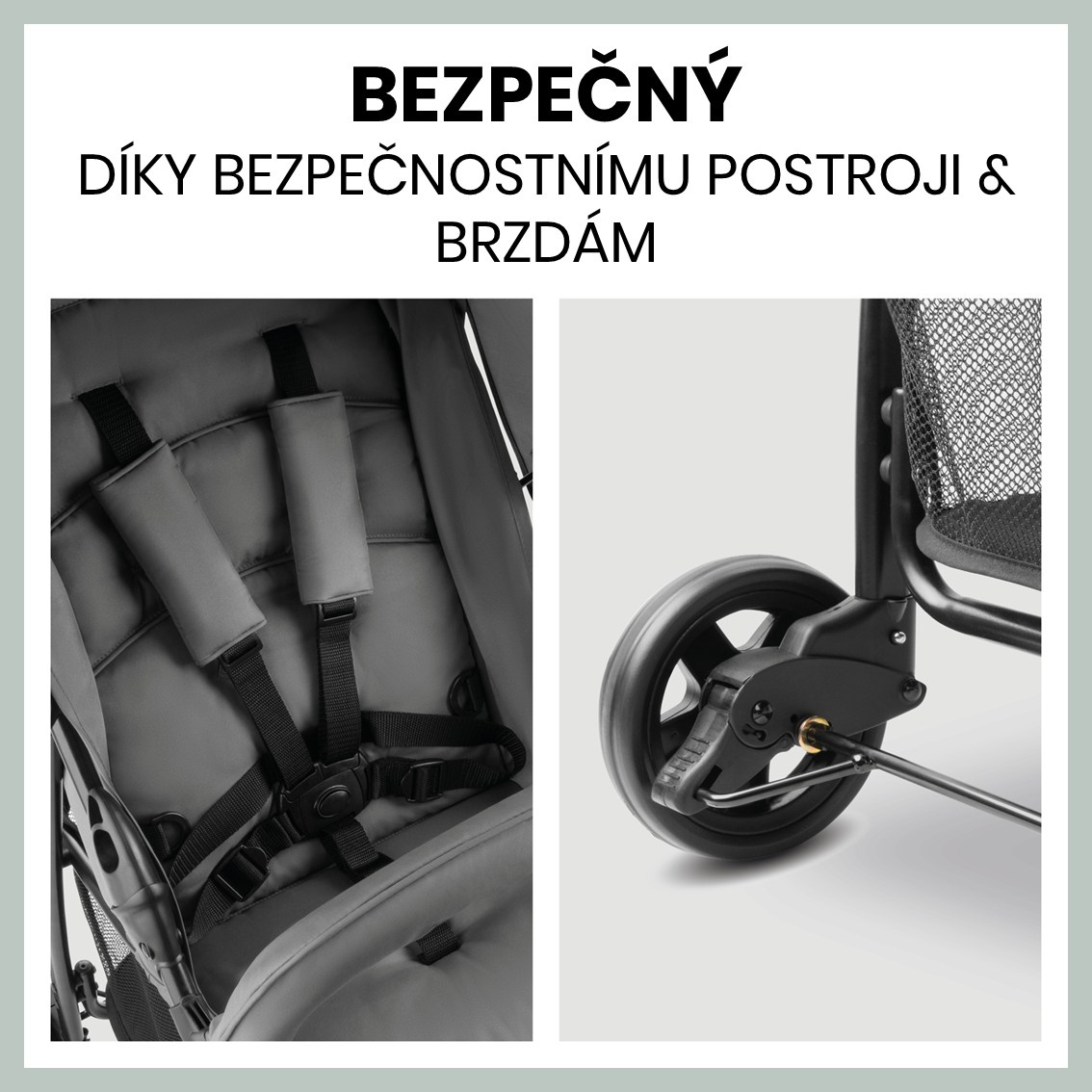 BEZPEČNOSTNÍ POSTROJ A BRZDY PRO ZAJIŠTĚNÍ BEZPEČNOSTI // Abyste si mohli v poklidu užívat svou procházku s děťátkem je kočárek vybaven pohodlným bezpečnostním postrojem a brzdou, která bezpečně zajistí kočárek, kdykoli potřebujete.