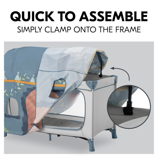 NASAZEN BĚHEM CHVILIČKY // Zcela bez použití nářadí: stan jednoduše nasadíte a připevníte na rám své cestovní postýlky a stejně rychle jej opět složíte.