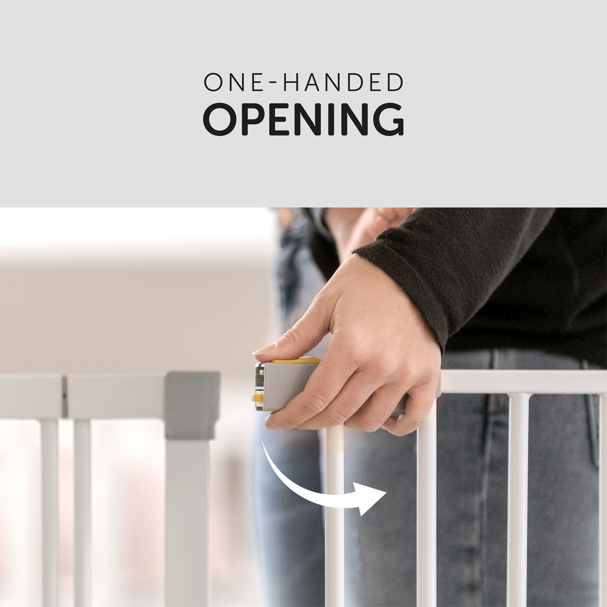 Dvojitý zámek zabraňuje nekontrolovanému otevírání zábrany, dospělí mohou otevřít dveře v obou směrech jednou rukou.
