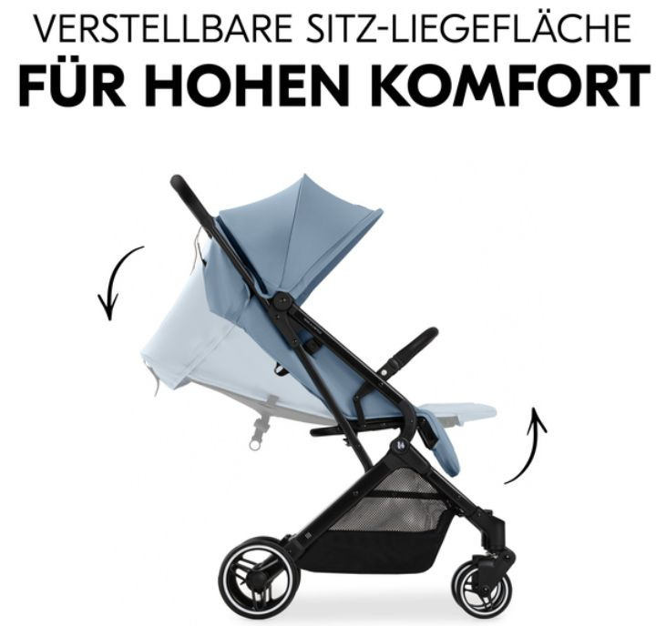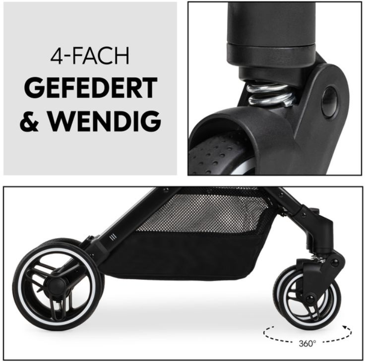 Vaše dítě pojede vždy bezpečně díky odpružení s tlumením nárazů ve 4 směrech nárazů a kolům pro lehký chod. Díky předním kolům otočným o 360 stupňů zvládnete každou zatáčku. Na spaní stačí jednou rukou lehce posunout opěradlo do polohy vleže. Sluneční stříška s průzorem (UV faktor 50+) poskytuje ochranu před sluncem a vy máte své dítě neustále na očích.