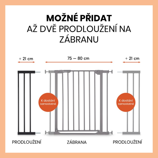 POKUD potřebujete prodloužit svou zábranu můžete si vybrat hned ze dvou nabízených velikostí + 9 cm / nebo + 21 cm. K vaší zábraně hauck je možné přidat až dvě prodloužení (2 x 9 cm nebo 2 x 21 cm). Navíc můžete zkombinovat i dvě různé velikosti prodloužení (9 cm a 21 cm). Máte kulaté zábradlí? Žádný problém, k prodloužení je možné dokoupit speciální extérní adaptéry „Y“ na kulatá zábradlí.