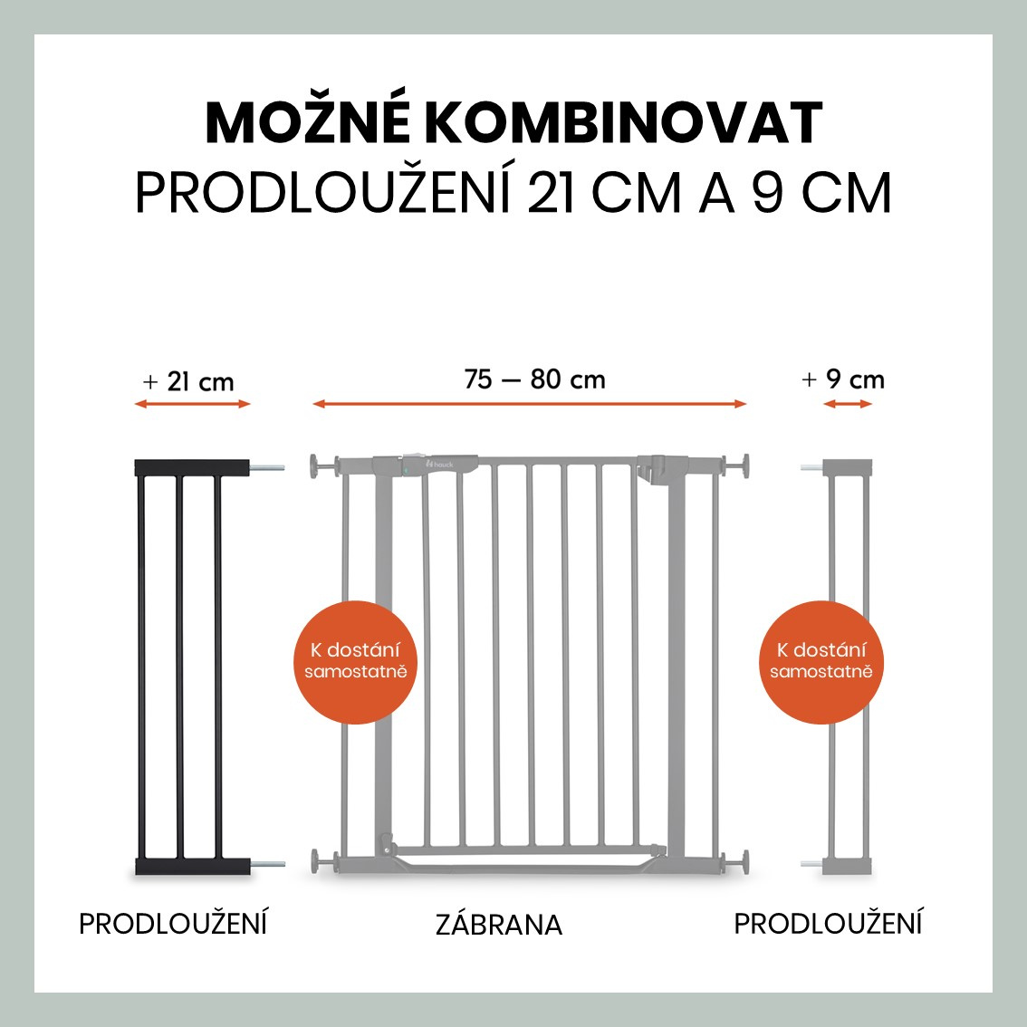 POKUD potřebujete prodloužit svou zábranu můžete si vybrat hned ze dvou nabízených velikostí + 9 cm / nebo + 21 cm. K vaší zábraně hauck je možné přidat až dvě prodloužení (2 x 9 cm nebo 2 x 21 cm). Navíc můžete zkombinovat i dvě různé velikosti prodloužení (9 cm a 21 cm). Máte kulaté zábradlí? Žádný problém, k prodloužení je možné dokoupit speciální extérní adaptéry „Y“ na kulatá zábradlí.