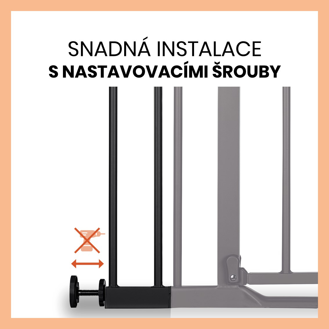 STABILNÍ a bezpečná instalace bez VRTÁNÍ // PRODLOUŽENÍ se jednoduše připevní k zábraně pomocí dvou spojovacích prvků, poté se pomocí polohovacích šroubů z venkovní strany bezpečně upevní do rámu dveří / nebo proti zdi či schodišti.