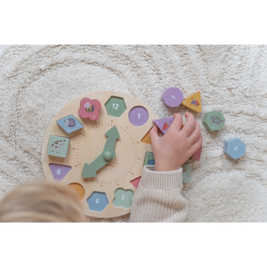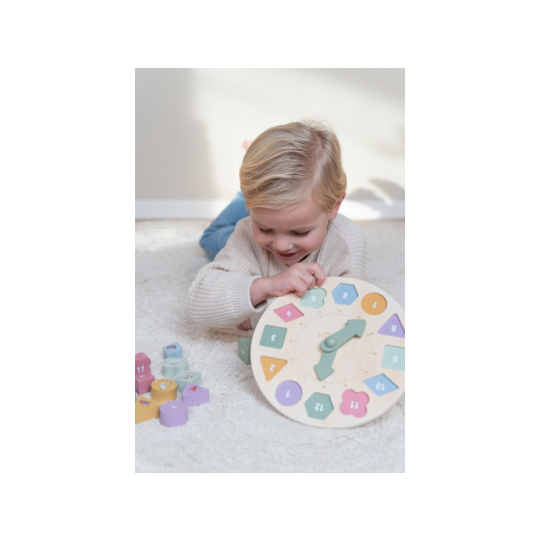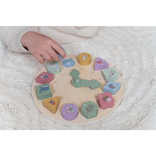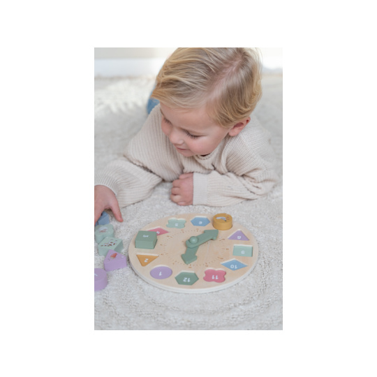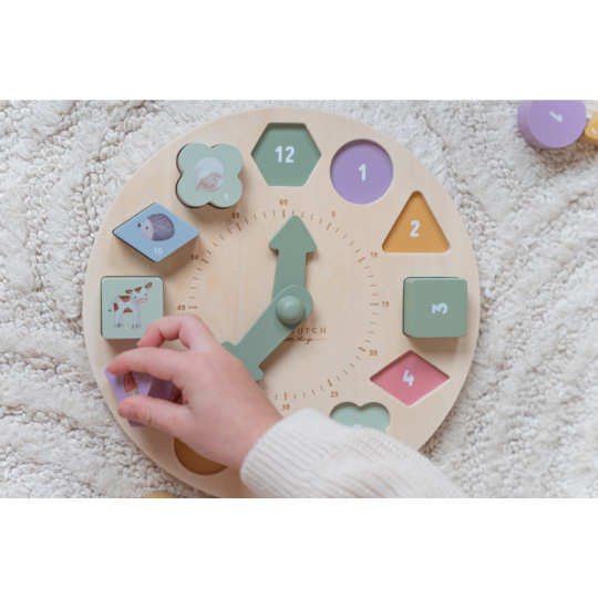 Kolik je hodin? Originální dřevěné puzzle v podobě ručičkových hodin naučí vaše dítě hravou formou poznávat čas. Hodiny mají pohyblivé ručičky a obsahují 12 kostek různých tvarů a barev s čísly, které pasují do odpovídajících otvorů na ciferníku. Pro zábavnější učení je na každé kostce obrázek zvířátka. S pomocí puzzle hodin Little Dutch se děti učí rozpoznávat barvy, čísla, tvary i zvířátka. Hodiny jsou součástí designové kolekce hraček a doplňků Little Dutch Farma. Rozměry: 22 x 22 x 2,3 cm Vhodné pro děti od 2 let.