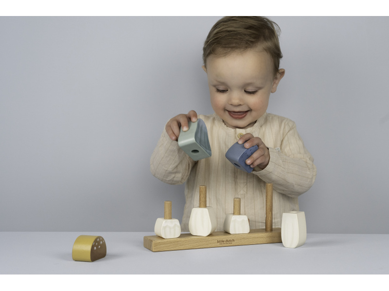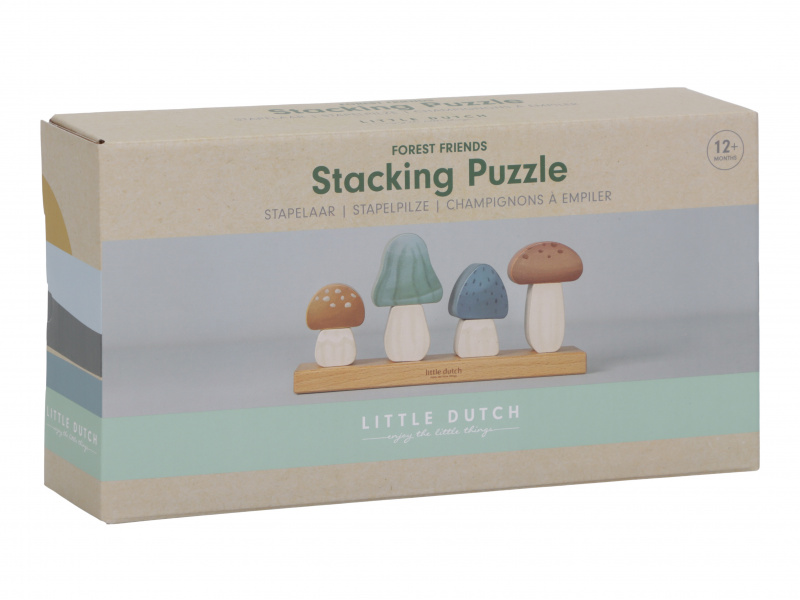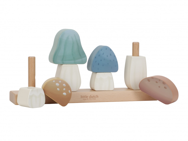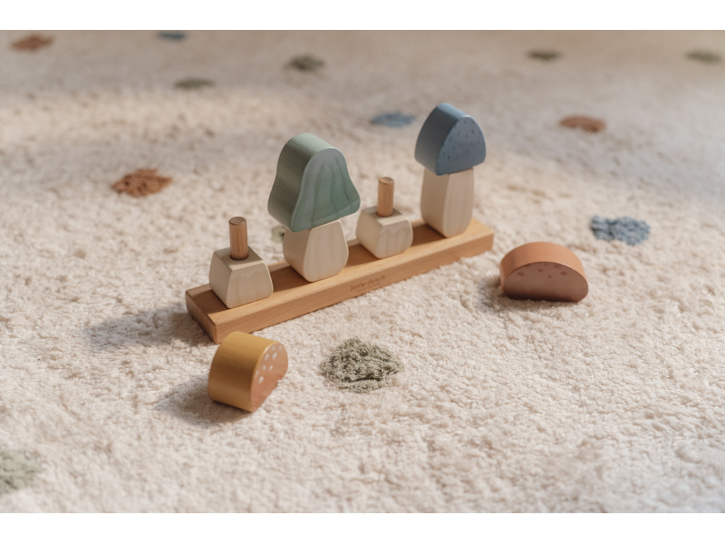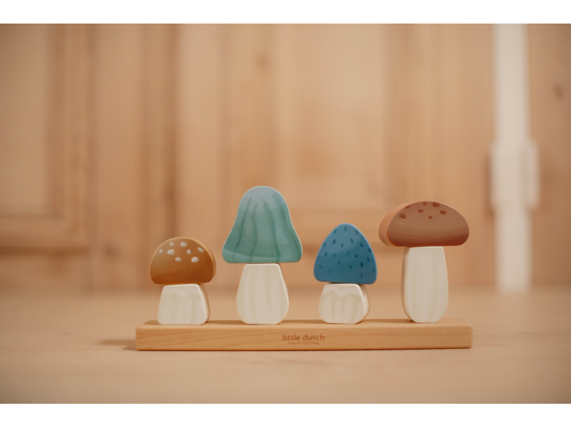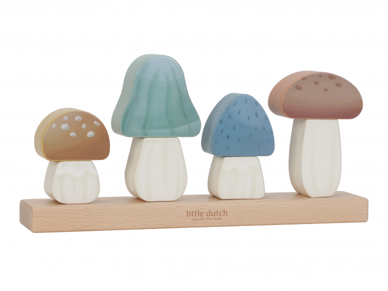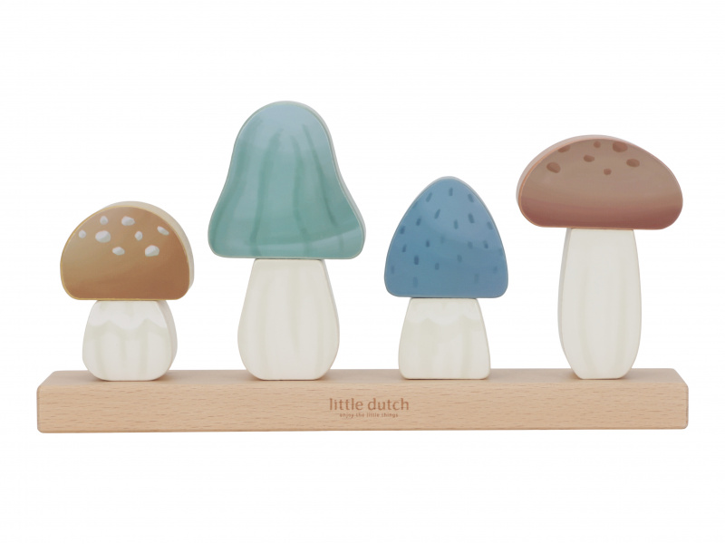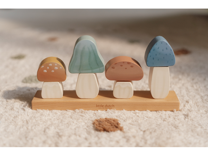 Krásné dřevěné houby jsou tvořeny dvěma díly - kloboučkem a nohou, které se postupně navlékají na stonek na základně. Kloboučky a nohy jsou libovolně kombinovatelné a je tak možné tvořit pokaždé jiné varianty houbiček. Hračka pomáhá rozvíjet jemnou motoriku dítěte a může sloužit i jako krásná dekorace v dětském pokoji. Hračka je součástí designové kolekce hraček Little Dutch Forest Friends inspirované životem v lese. Vyrobeno z dřeva certifikovaného FSC. Rozměry: 24,6 x 5 x 13 cm Vhodné pro děti od 12 měsíců.