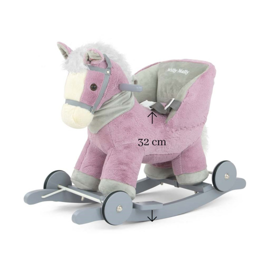 Měkoučký houpací koník Polly byl navržen pro nejmladší děti, pro které jsou tradiční houpací koně příliš velké. Pohodlné a tvarované sedadlo ve tvaru křesla a nastavitelné popruhy poskytují pohodlí a bezpečnost během bezstarostného houpání vašeho dítěte. Opěrky pro nohy na lištách a rukojeti ještě více pomáhají udržet rovnováhu. Překlopením jednoduchého mechanismu na lištách vysunete kolečka, čímž ve vteřině změníte houpací hračku v jezdícího koníka. Houpací lišty lze jednoduše odšroubovat. Po stisknutí ouška koník vesele zařechtá, po stisknutí druhého vydá zvuk klusajícího koně. Baterie se vkládají do poudra umístěného na bříšku.