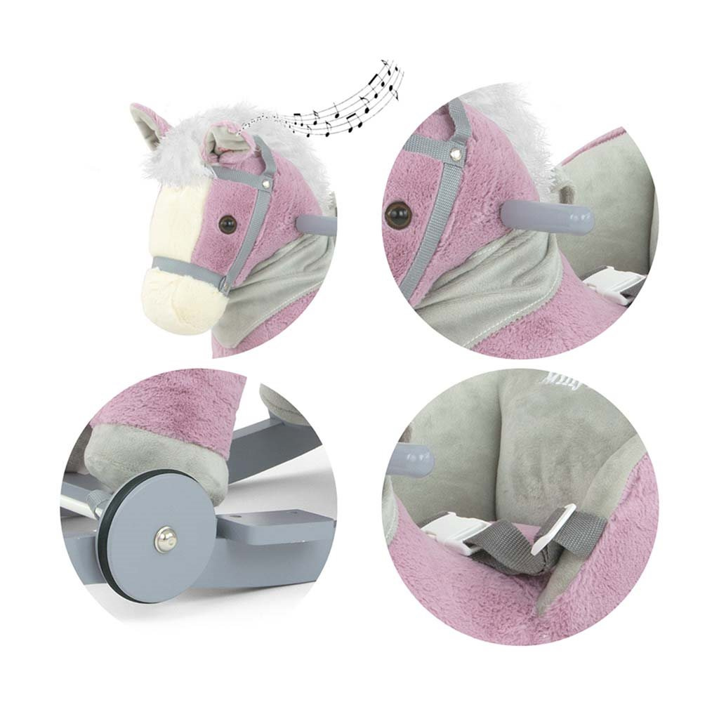 Měkoučký houpací koník Polly byl navržen pro nejmladší děti, pro které jsou tradiční houpací koně příliš velké. Pohodlné a tvarované sedadlo ve tvaru křesla a nastavitelné popruhy poskytují pohodlí a bezpečnost během bezstarostného houpání vašeho dítěte. Opěrky pro nohy na lištách a rukojeti ještě více pomáhají udržet rovnováhu. Překlopením jednoduchého mechanismu na lištách vysunete kolečka, čímž ve vteřině změníte houpací hračku v jezdícího koníka. Houpací lišty lze jednoduše odšroubovat. Po stisknutí ouška koník vesele zařechtá, po stisknutí druhého vydá zvuk klusajícího koně. Baterie se vkládají do poudra umístěného na bříšku.