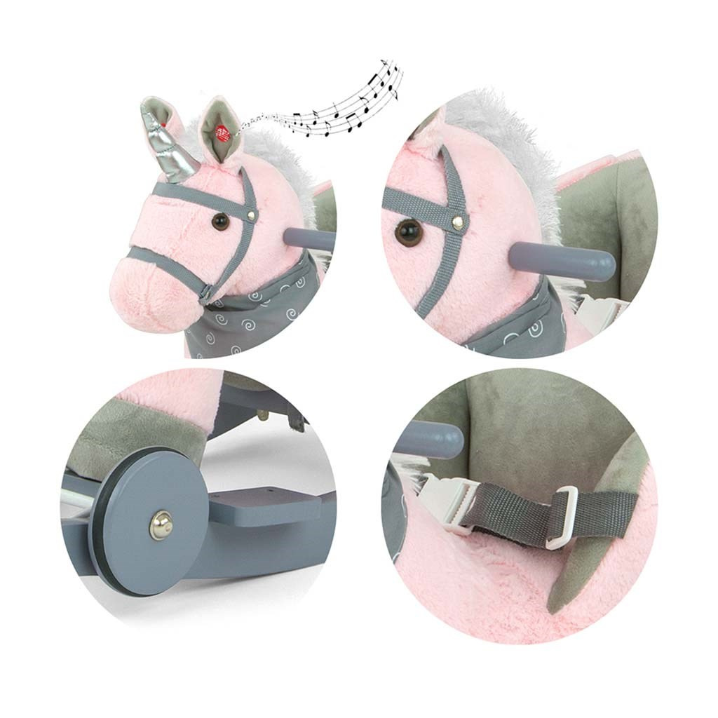 Měkoučký houpací koník Polly byl navržen pro nejmladší děti, pro které jsou tradiční houpací koně příliš velké. Pohodlné a tvarované sedadlo ve tvaru křesla a nastavitelné popruhy poskytují pohodlí a bezpečnost během bezstarostného houpání vašeho dítěte. Opěrky pro nohy na lištách a rukojeti ještě více pomáhají udržet rovnováhu. Překlopením jednoduchého mechanismu na lištách vysunete kolečka, čímž ve vteřině změníte houpací hračku v jezdícího koníka. Houpací lišty lze jednoduše odšroubovat. Po stisknutí ouška koník vesele zařechtá, po stisknutí druhého vydá zvuk klusajícího koně. Baterie se vkládají do poudra umístěného na bříšku.
