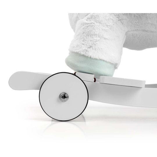 Koník má dřevěné lyžiny s opěrkami na nohy a madla, která pomáhají udržet rovnováhu při hraní, a také sadu skládacích koleček, díky kterým se během pár vteřin promění v úžasné plyšové vozítko.