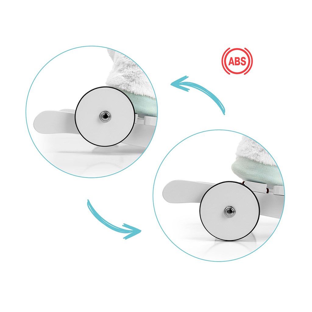 Koník má dřevěné lyžiny s opěrkami na nohy a madla, která pomáhají udržet rovnováhu při hraní, a také sadu skládacích koleček, díky kterým se během pár vteřin promění v úžasné plyšové vozítko.