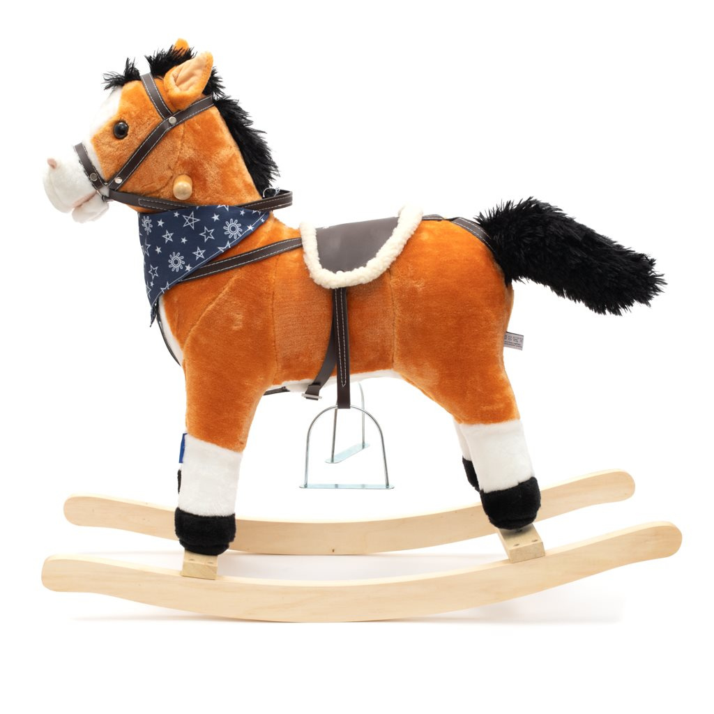 Měkoučký houpací koník Baby Mix byl navržen pro děti, které mají rády dobrodružství. Vypadá jako opravdový, takže se vaše dítě bude cítit jako skutečný jezdec. Koník je vyroben z měkkého plyše, kolem krku má ozdobný šátek a je vybaven dřevěnými houpacími lištami, jejichž profil chrání dítě před převrácením. Pohodlné sedlo, pevná uzda, kovové třmeny, dřevěné rukojeti a stabilní houpací lišty zajistí vašim kovbojům ještě větší stabilitu a pohodlí během houpání. Je vyroben z měkkého plyšového materiálu, pevné dřevěné lišty nebo rukojeti lze snadno odšroubovat. Po stisknutí tlačítek na ouškách koník vrtí ocáskem, hýbe tlamičkou, ozvou se zvuky cvalu, koník zařehtá a zazpívá kovbojskou písničku. Tři potřebné baterie AA 1,5 V se vkládají do pouzdra umístěného na bříšku koníka a nejsou součástí balení. Během houpání se dítě učí koordinovat pohyby svého těla s koníkem, což zlepšuje celkovou rovnováhu a motoriku dítěte.