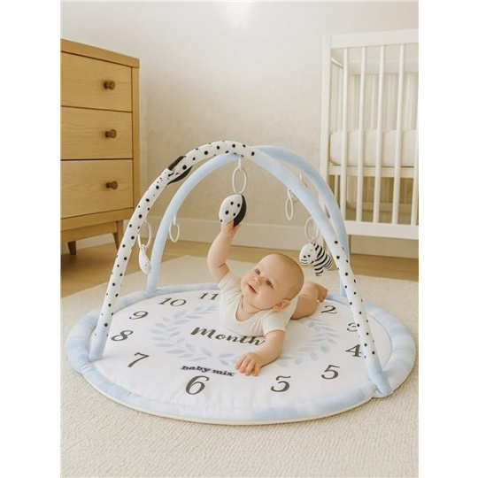 Krásná vzdělávací hrací deka s hrazdičkou rozvíjí dětskou představivost prostřednictvím poznávání barev a tvarů. Měkká podložka s důmyslným designem je lehká a snadno se přenáší. Závěsné hračky: chrastítko, pískátko. Čelenka je odnímatelná, stejně jako hračky. Příjemný a měkký materiál umožňuje pohodlné ležení na břiše nebo na zádech a umožňuje dítěti volný pohyb. podložka je potištěna měsíci, takže rodiče mohou zachytit tyto prchavé okamžiky, jak jejich dítě roste. Vzdělávací podložka poskytuje bezpečný a příjemný prostor a stane se oblíbeným místem pro hraní vašeho dítěte. Rozměry: průměr: cca 89 cm, výška cca 58 cm. Vhodné pro děti od 3 měsíců.