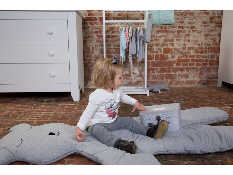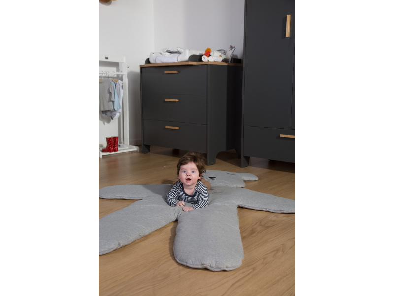 Měkká hrací deka v podobě obrovského medvěda zpříjemní hraní dítěte na zemi a zároveň slouží jako krásná dekorace dětského pokoje. Deka je potažena příjemnou žerzejovou textilií ze 100% bavlny. Výplň: 100% polyester. Rozměry: 150 x 123 x 5 cm