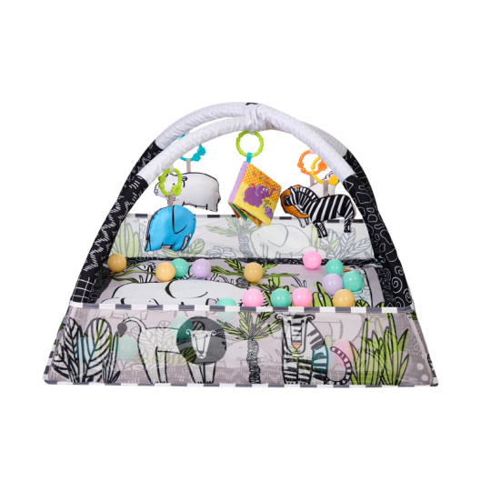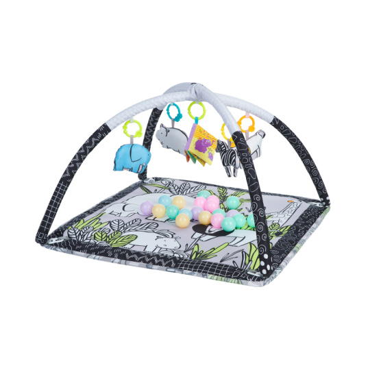 Hrací deka s hrazdou KikkaBoo Jungle je ideální volbou pro rozvoj dítěte v prvních letech života. Pohodlná hrací deka s krásnými motivy ze života v džungli je navržena tak, aby podporovala smyslový rozvoj a motorické dovednosti dítěte od narození až do 36 měsíců. Všestranné možnosti hry Vhodná pro hru na zádech, na bříšku i vsedě Podporuje rozvoj jemné i hrubé motoriky během jednotlivých vývojových fází Stimulující prostředí pro smysly Obsahuje 18 barevných míčků pro zábavnou hru Odnímatelná hrazda s interaktivními hračkami poskytuje vizuální a hmatovou stimulaci Pomáhá rozvíjet koordinaci rukou a nohou natahováním a kopáním Bezpečný a přizpůsobivý prostor Umožňuje uzavřít všechny čtyři strany pro vytvoření útulného prostředí pro hru Vhodné i jako míčkový bazének pro větší děti Rozměry: 78 × 75 × 50 cm Hmotnost: 0,61 kg Vhodné pro děti od narození.