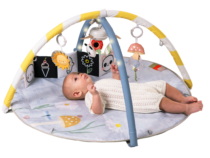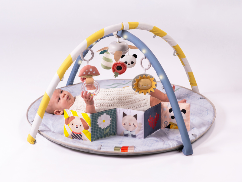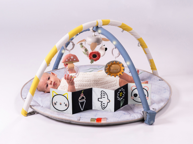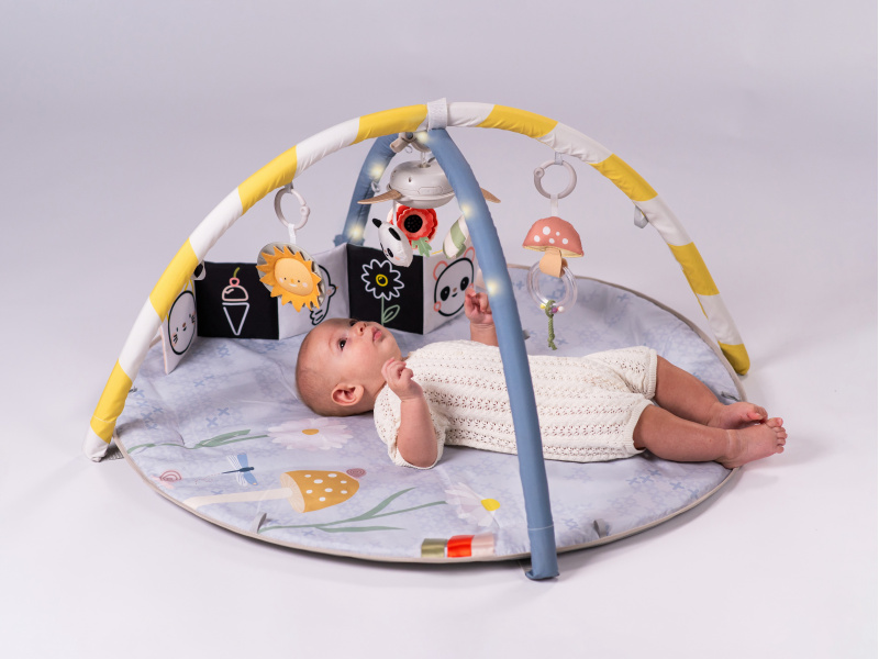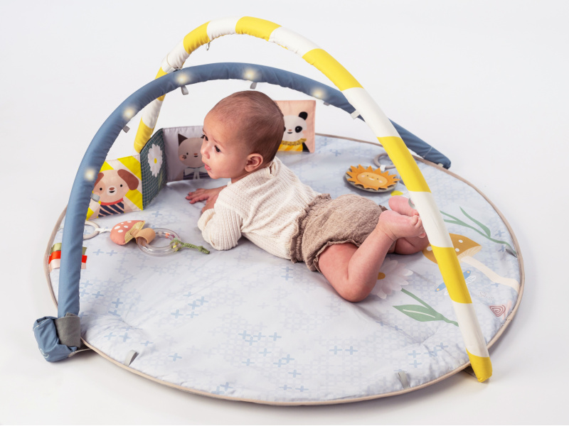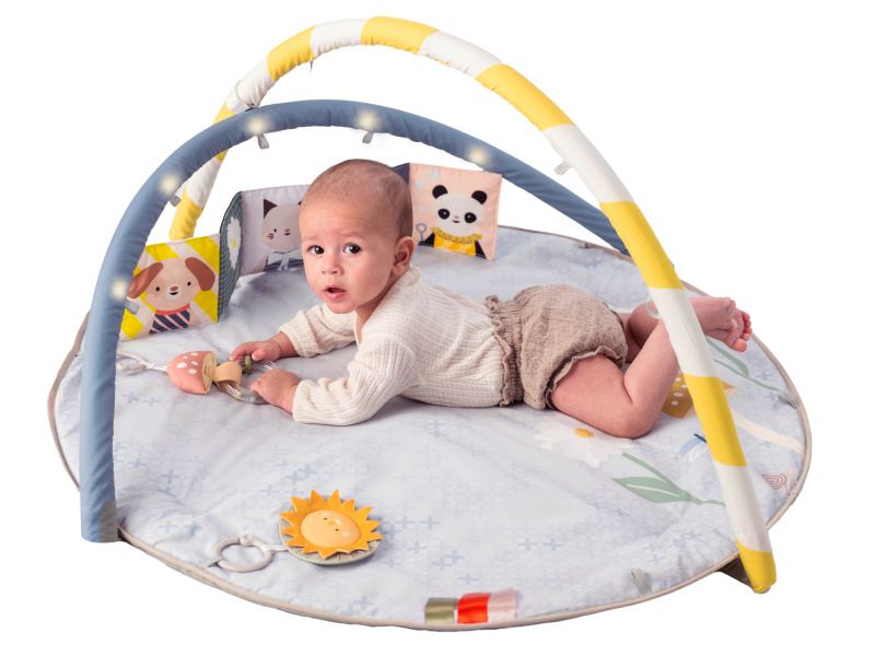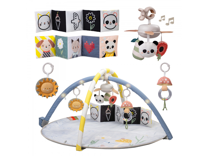 Interaktivní hrací deka Taf Toys s osvětlenou hrazdou, hudebním kolotočem a množstvím různorodých aktivit je dokonalým smyslovým hrištěm pro miminka. Podněcuje rozvoj jeho jednotlivých smyslů, motoriky a zvídavosti již od narození. Proč si ji zamilujete: Odnímatelný hudební kolotoč s melodiemi (22 minut) - uklidňující hudba podporuje sluchovou stimulaci a vytváří atmosféru pro hraní i relaxaci Nastavitelné oblouky hrazdy s LED světýlky - pohyblivé světelné body pomáhají rozvíjet zrak a sledování pohybu očima (vizuální tracking) Všestranné hračky - chrastítko ve tvaru houby, sluníčko s kousátkem a oboustranná šusticí knížka (černobílá a barevná) rozvíjí hmat i zrak podle věku dítěte Polstrovaná hrací podložka - měkká a bezpečná pro ležení i první pokusy o přetáčení či lezení, knížka a stužky navíc motivují k aktivitě na bříšku Přizpůsobení deky dle věku dítěte - možnost úprav podle vývojové fáze dítěte od novorozenců až po zvídavá batolata Co podporuje: Smyslový rozvoj - různorodé textury, zvuky, světla a ilustrace aktivují sluch, zrak i hmat dítěte Hrubá a jemná motorika - miminko se učí natahovat, uchopovat a pohybovat se díky stimulujícím prvkům Zrakové sledování - oblouky hrazdy s LED světýlky rozvíjí schopnost sledování pohybu očima a podporují soustředění Kognitivní růst - interaktivní hraní posiluje zvědavost, schopnost objevování a první poznávání Koordinace oko-ruka - chrastítko, kousátko i šusticí knížka motivují k rozvoji koordinace zraku a rukou Baterie 5xAAA nejsou součástí balení. Vhodné pro děti od narození.