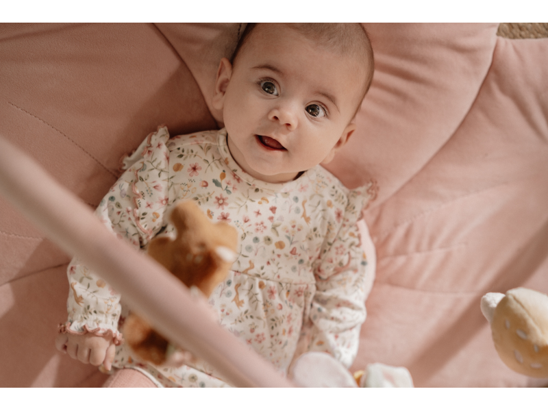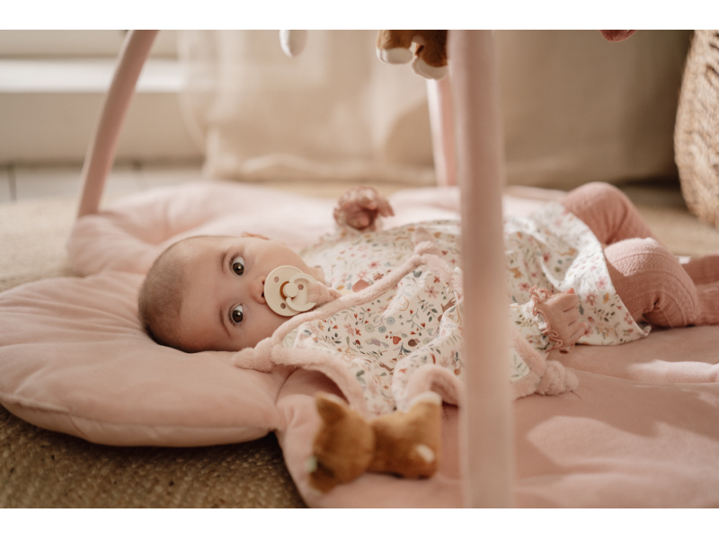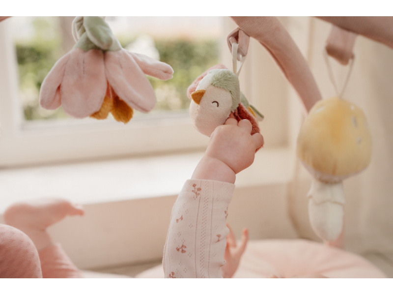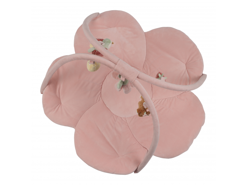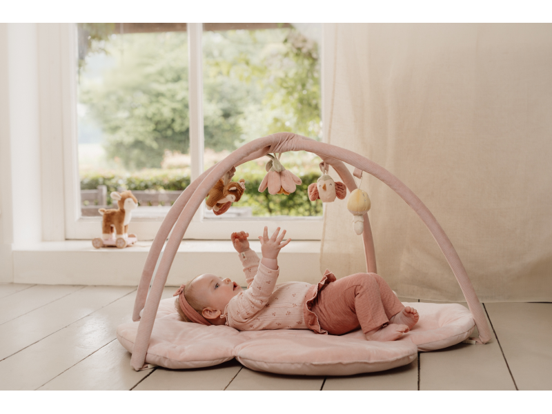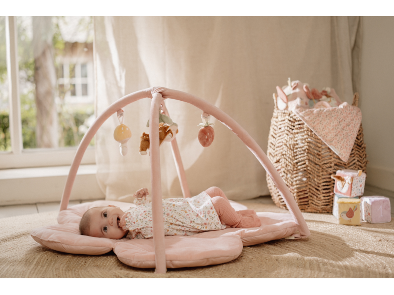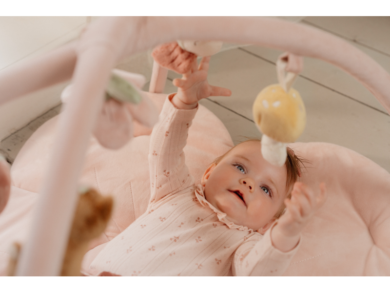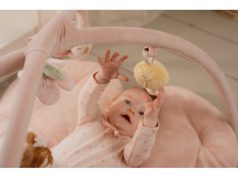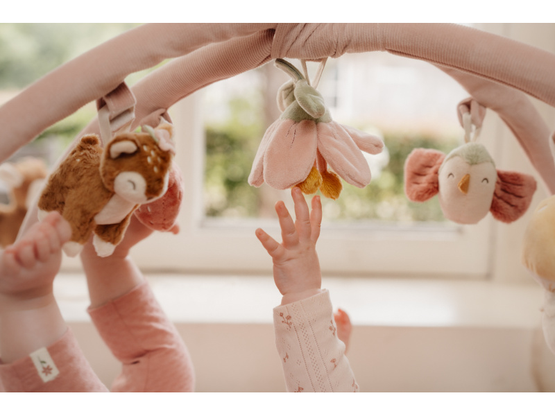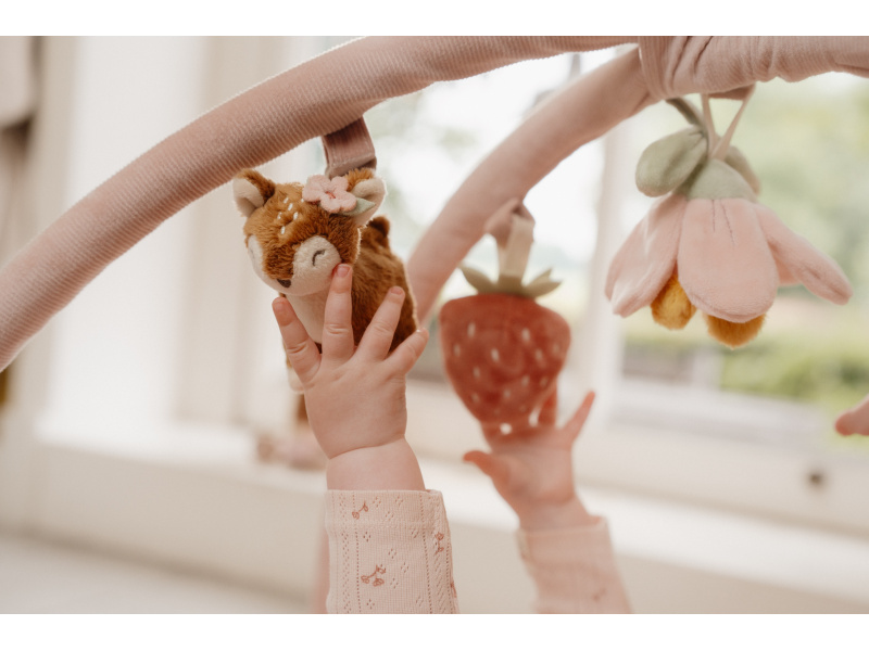 Měkká hrací deka ve tvaru květiny s hrazdou, na které jsou zavěšené hračky v podobě srnky, ptáčka, květiny, jahůdky a houby. Při zkoumání hraček upoutá pozornost dítěte chrastění, šustění, pískání i zvonění. Hračky jsou odnímatelné a je možné je používat i samostatně. Hrací deka s hračkami podporuje rozvoj smyslů dítěte i jeho jemné motoriky. Hrací deka je součástí designové kolekce hraček Little Dutch Fairy Garden inspirované životem na zahradě. Rozměry: 90 x 90 x 48 cm Vhodné pro děti od narození.
