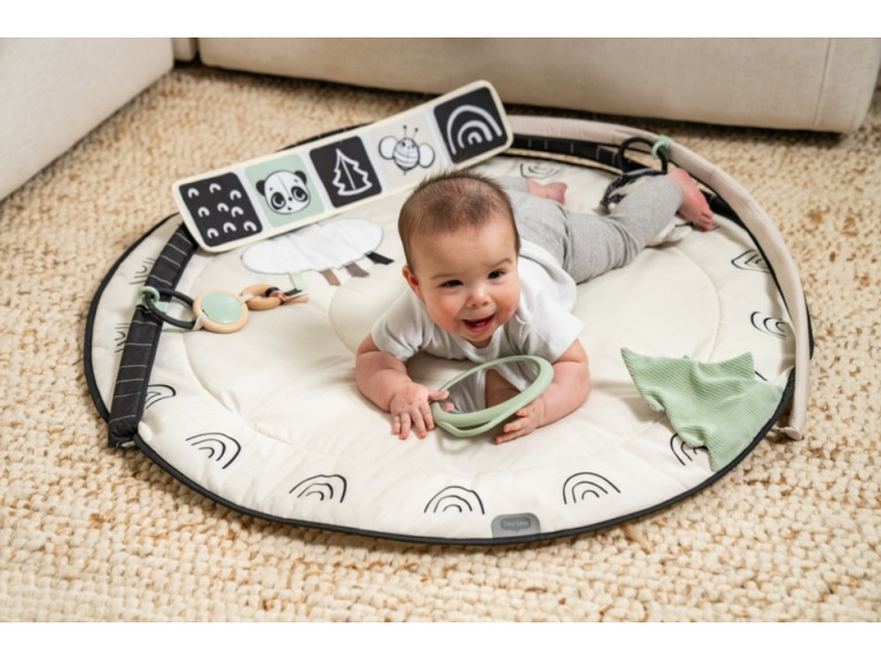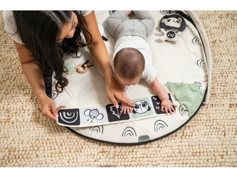 Hrací deka s hrazdou Tiny Love Gymini Black & White v unikátním černo-bílém provedení, které upoutá pozornost dítěte již od narození, nabízí různorodé aktivity k zabavení a stimulaci smyslů dítěte. Posuvný středový díl umožňuje přizpůsobit hrazdu věku dítěte, hraní na bříšku apod. Hudební box v podobě lva hraje tři různé melodie a dítě si je aktivuje samo dotykem. Bezpečné zrcátko a textilní knížka ve tvaru leporela podněcují dítě ke hraní na bříšku. Závěsné hračky a množství dalších aktivit přímo na dece stimulují různé smysly dítěte. Jednotlivé hračky včetně hudebního boxu je možné používat i samostatně mimo deku. Hrazdu je možné ve starším věku dítěte odstranit a deku dál používat jako hrací podložku. Rozměr 90 x 90 x 65 cm. Baterie 3xLR44 / AG13 (1,5V) jsou součástí. Vhodné od narození.