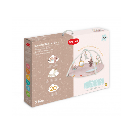 Hrací deka s hrazdou Tiny Love Gymini Unicorn Wonderlands v jemných pastelových barvách s pohádkovým motivem jednorožce nabízí různorodé aktivity k zabavení a stimulaci smyslů dítěte již od narození. Posuvný středový díl umožňuje přizpůsobit hrazdu věku dítěte, hraní na bříšku apod. Hudební box v podobě komety hraje melodie a dítě si je aktivuje samo dotykem. Bezpečné zrcátko i polštářek ve tvaru půlměsíce podněcují dítě ke hraní na bříšku. Závěsné hračky včetně chrasticího jednorožce a množství dalších aktivit přímo na dece stimulují různé smysly dítěte. Jednotlivé hračky je možné používat i samostatně mimo deku. Hrazdu je možné ve starším věku dítěte odstranit a deku dál používat jako hrací podložku. Rozměry: 90 x 90 x 47 cm Vyměnitelné baterie 3x LR44 / AG13 (1,5V) jsou součástí. Vhodné pro děti od narození.