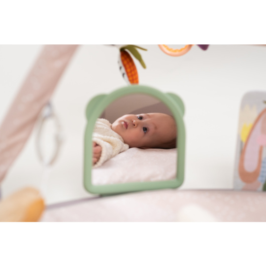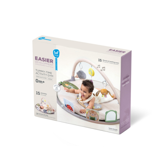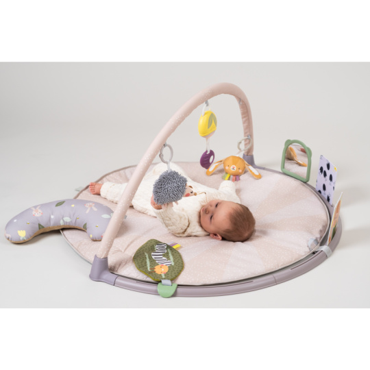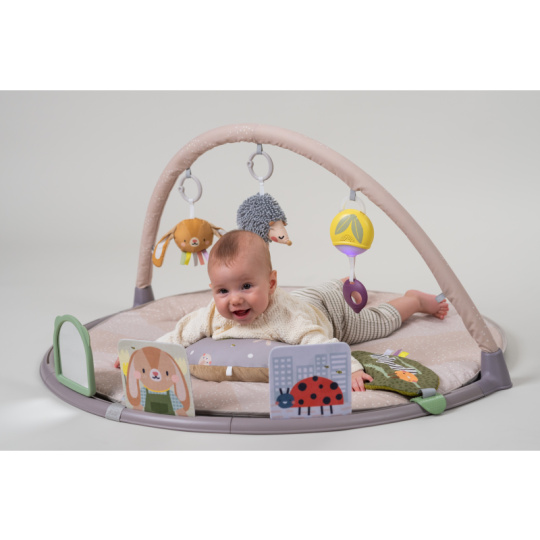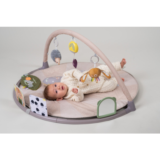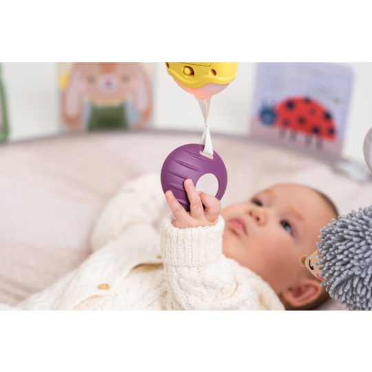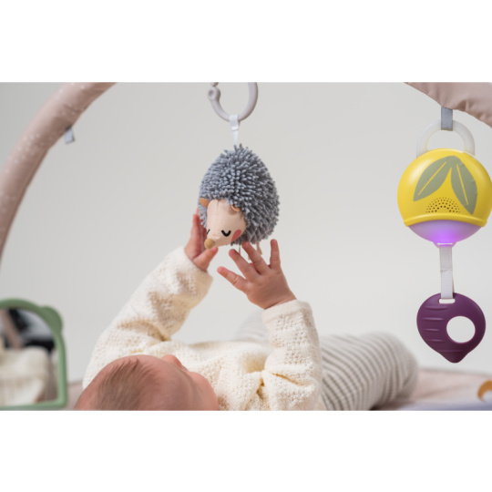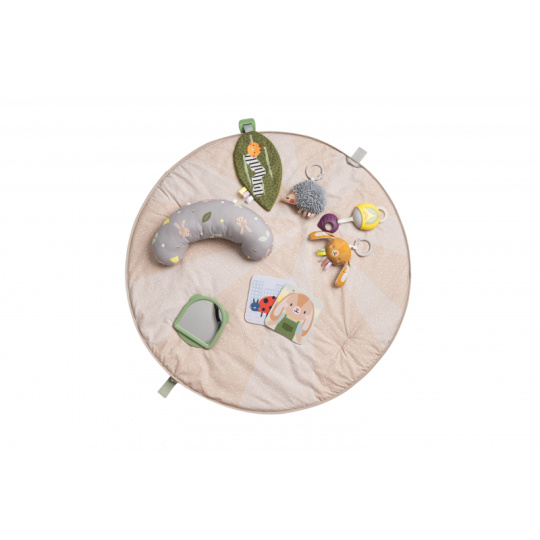 Měkká hrací deka s množstvím různorodých aktivit pro zkoumání a objevování je navržena pro různá věková stádia vývoje dítěte od narození. Originální odnímatelné hračky včetně bezpečného zrcátka upoutají pozornost dítěte a zajistí mu hodiny zábavy vleže na zádech, na boku i na bříšku. Speciální půlkruhová lišta po obvodu deky je určena pro umístění karet s výraznými obrázky a motivy, které společně se speciálně tvarovaným polštářkem podněcují dítě ke hře na bříšku. Vysoce kontrastní černobílé ilustrace jsou určeny pro děti od narození do 3 měsíců, ilustrace ve výrazných barvách jsou ideální pro děti od 3 měsíců. Poloha na bříšku přináší děťátku jiný pohled na svět a posiluje krční a zádové svaly, které později umožňují dítěti začít se přetáčet, lézt a sedět bez opory. Součástí hrazdy jsou odnímatelné hračky, které můžete využít i samostatně mimo hrací deku: hudební box se světýlkem aktivovaný zatáhnutím za kroužek chrasticí králíček s šusticíma ušima a barevnými stužkami cinkající ježek šusticí list se stužkami dvě oboustranné karty s obrázky bezpečné zrcátko se silikonovým rámečkem polštářek pro hru na bříšku Hudební box hraje uklidňující melodie v celkové délce 15 minut. Melodie se aktivují zatáhnutím za kroužek a dítě se tak učí příčině a následku. Hudební box je možné snadno připevnit i k postýlce nebo autosedačce. Rozměry: 87 x 87 cm Baterie 2xAAA nejsou součástí balení. Vhodné pro děti od narození.