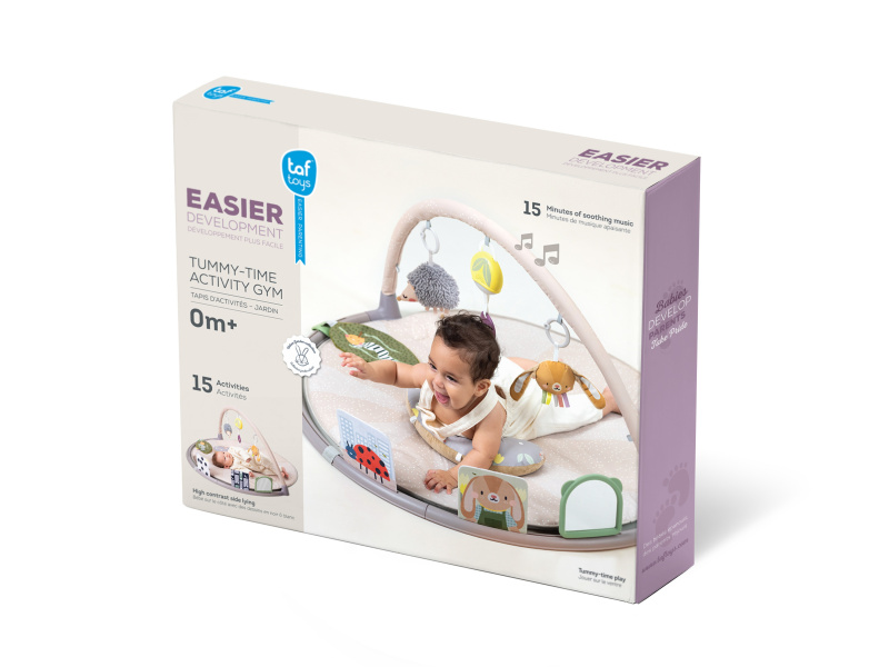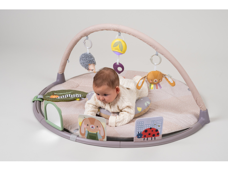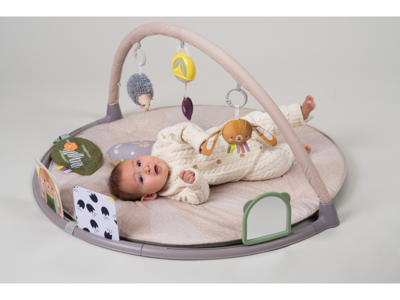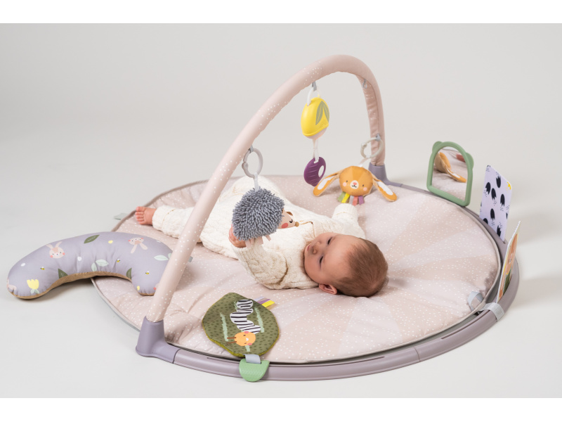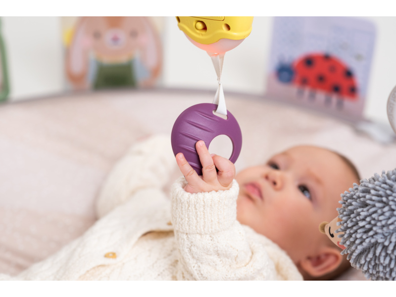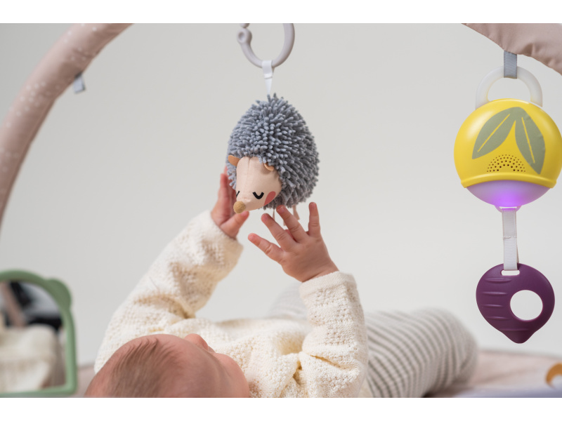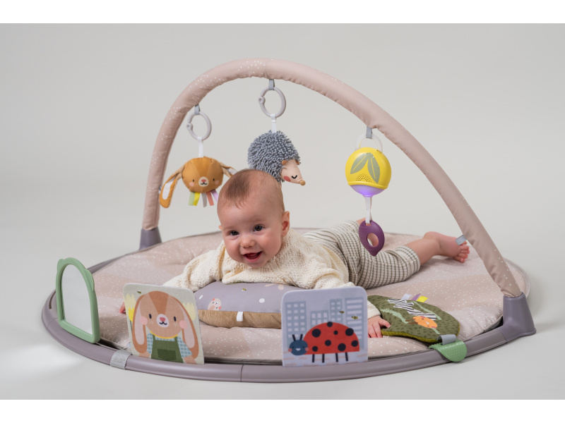 Měkká hrací deka s množstvím různorodých aktivit pro zkoumání a objevování je navržena pro různá věková stádia vývoje dítěte od narození. Originální odnímatelné hračky včetně bezpečného zrcátka upoutají pozornost dítěte a zajistí mu hodiny zábavy vleže na zádech, na boku i na bříšku. Speciální půlkruhová lišta po obvodu deky je určena pro umístění karet s výraznými obrázky a motivy, které společně se speciálně tvarovaným polštářkem podněcují dítě ke hře na bříšku. Vysoce kontrastní černobílé ilustrace jsou určeny pro děti od narození do 3 měsíců, ilustrace ve výrazných barvách jsou ideální pro děti od 3 měsíců. Poloha na bříšku přináší děťátku jiný pohled na svět a posiluje krční a zádové svaly, které později umožňují dítěti začít se přetáčet, lézt a sedět bez opory. Součástí hrazdy jsou odnímatelné hračky, které můžete využít i samostatně mimo hrací deku: hudební box se světýlkem aktivovaný zatáhnutím za kroužek chrasticí králíček s šusticíma ušima a barevnými stužkami cinkající ježek šusticí list se stužkami dvě oboustranné karty s obrázky bezpečné zrcátko se silikonovým rámečkem polštářek pro hru na bříšku Hudební box hraje uklidňující melodie v celkové délce 15 minut. Melodie se aktivují zatáhnutím za kroužek a dítě se tak učí příčině a následku. Hudební box je možné snadno připevnit i k postýlce nebo autosedačce. Rozměry: 87 x 87 cm Baterie 2xAAA nejsou součástí balení. Vhodné pro děti od narození.