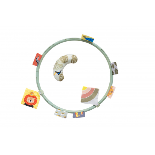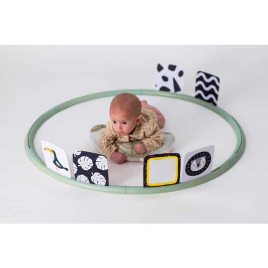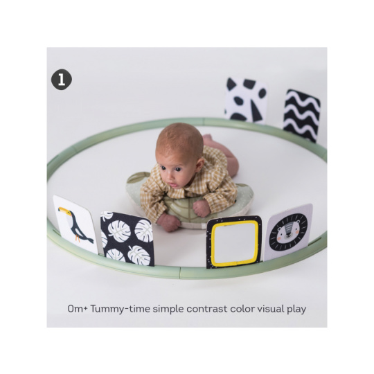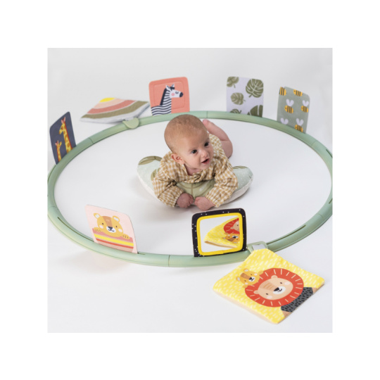 Unikátní hrací kruh nabízí 16 různých aktivit podporujících hraní dítěte na bříšku. Kruh se skládá z několika dílů, které rychle a jednoduše spojíte dohromady. Do otvorů v kruhu můžete připevnit libovolné kombinace aktivit a připravit tak dítěti vždy nové prostředí pro zkoumání a hraní. Polštářek z měkkého, příjemného materiálu je speciálně navržený, aby podporoval hraní dítěte na bříšku. Poloha na bříšku je důležitá pro posilování krčních a zádových svalů, které později umožňují dítěti začít se přetáčet, lézt a sedět bez opory. Sada obsahuje speciálně navržené aktivity pro dvě vývojová stádia dítěte. Pro miminko od narození jsou určeny vysoce kontrastní obrázky v černo-bílém provedení i bezpečné zrcátko. Pro děti od 3 měsíců jsou určeny obrázky ve výrazných barvách a dva textilní šusticí čtverce s různými obrázky a texturami pro zkoumání. Hračky pomáhají rozvíjet jednotlivé smysly dítěte a jeho motorické dovednosti. Hrací kruh je velmi snadné rozložit a uklidit, když jej právě nepoužíváte. Rozměry: Ø 90cm Vhodné pro děti od narození.