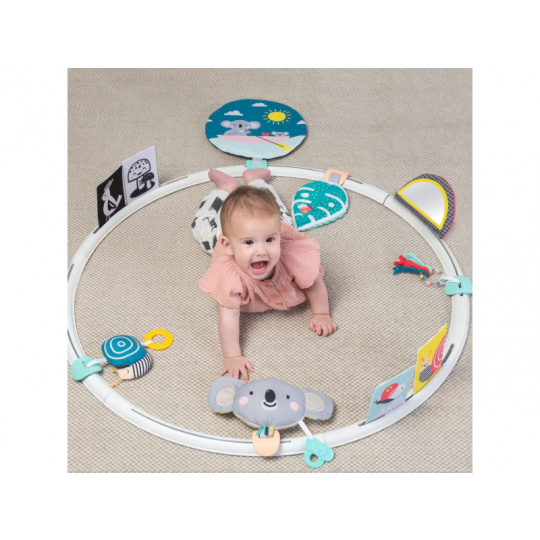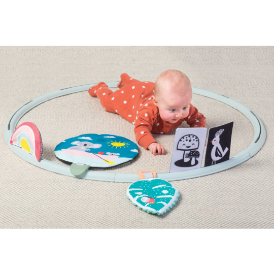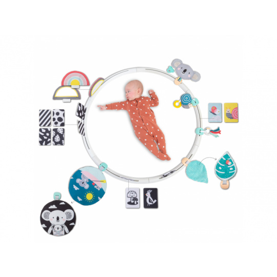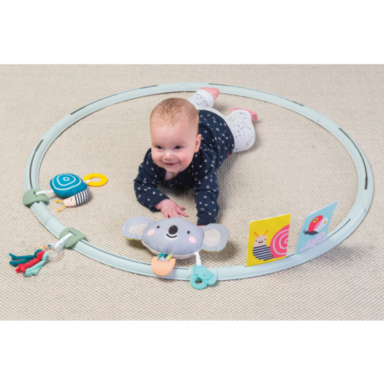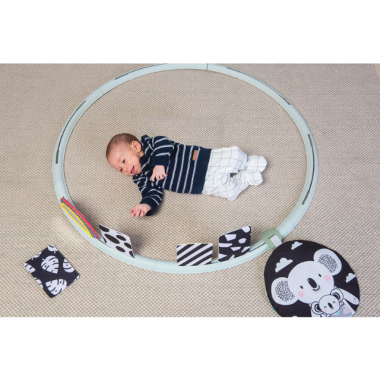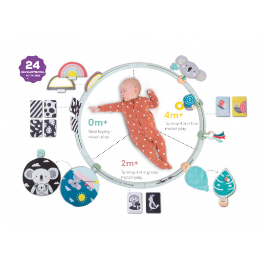 Unikátní hrací kruh nabízí 24 různých aktivit pro různá vývojová stádia dítěte od narození. Kruh se skládá z několika dílů, které rychle a jednoduše spojíte dohromady. Do otvorů v kruhu můžete připevnit libovolné kombinace aktivit a připravit tak dítěti vždy nové prostředí pro zkoumání a hraní. Pro miminko od narození jsou určeny vysoce kontrastní obrázky v černo-bílém provedení i bezpečné zrcátko. Pro děti od dvou měsíců jsou navrženy šusticí různobarevné hračky s výraznými barevnými obrázky. Děti od 4 měsíců mohou zkoumat rukama i ústy různorodé textury hraček, které po zmáčknutí šustí, pískají či chrastí. Aktivity umístěné před dítětem pomáhají zabavit dítě i při hře na bříšku. Poloha na bříšku je důležitá pro posilování krčních a zádových svalů, které později umožňují dítěti začít se přetáčet, lézt a sedět bez opory. Hračky pomáhají rozvíjet jednotlivé smysly dítěte a jeho motorické dovednosti. Hrací kruh je velmi snadné rozložit a uklidit, když jej právě nepoužíváte. Vhodné pro děti od narození.