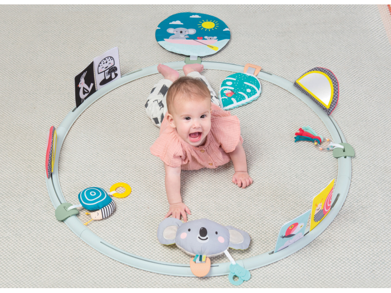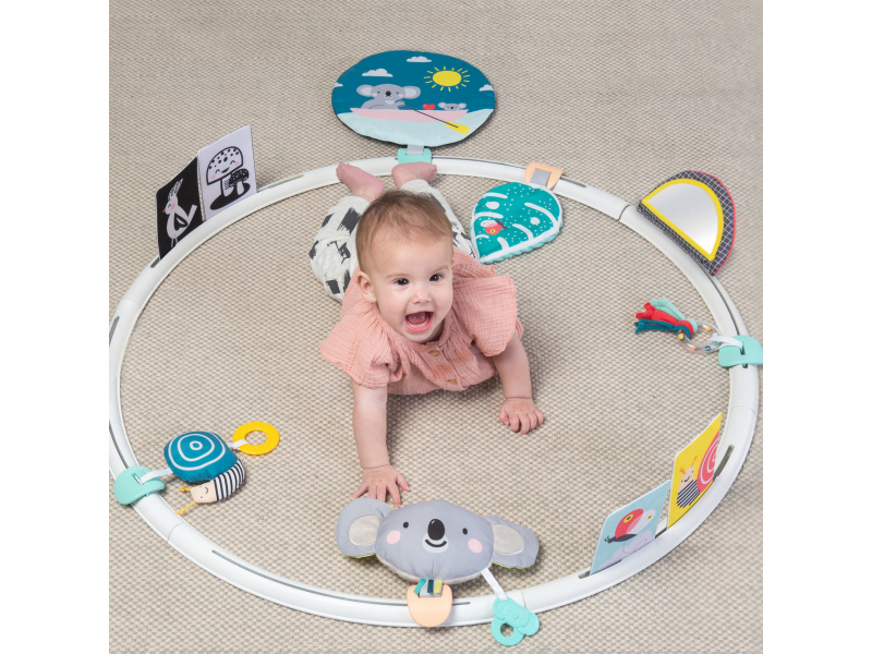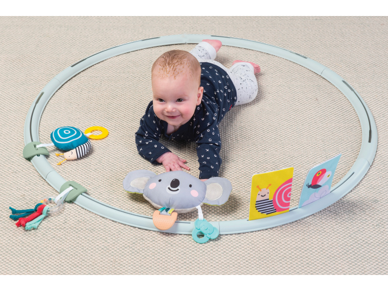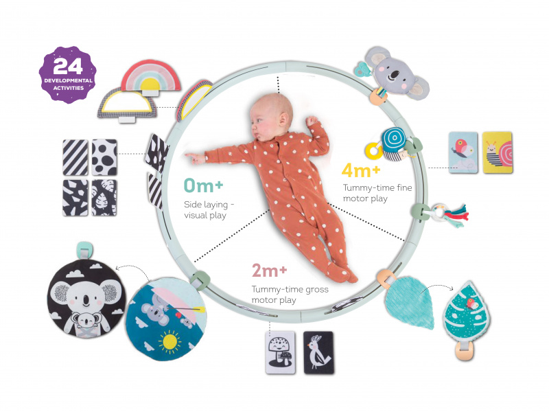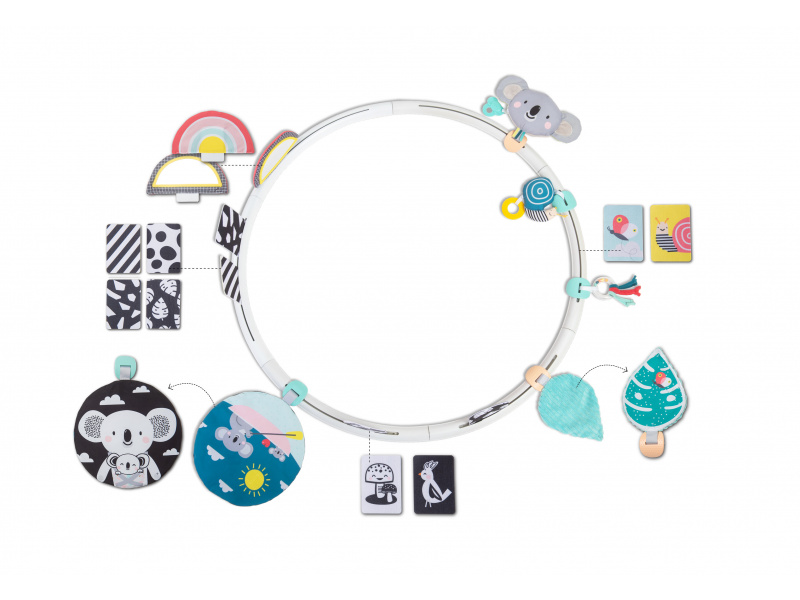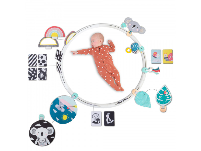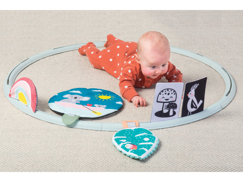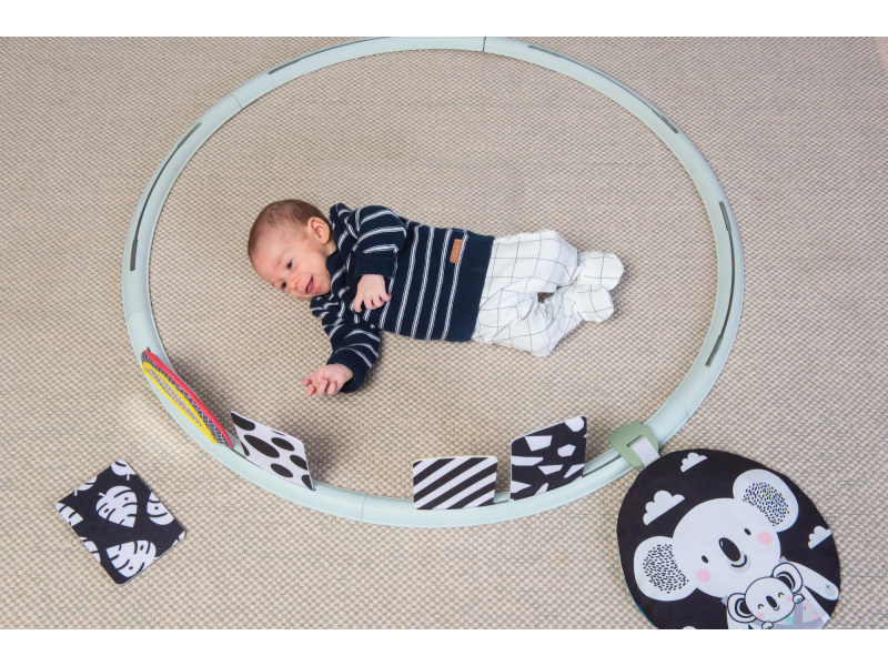 Unikátní hrací kruh nabízí 24 různých aktivit pro různá vývojová stádia dítěte od narození. Kruh se skládá z několika dílů, které rychle a jednoduše spojíte dohromady. Do otvorů v kruhu můžete připevnit libovolné kombinace aktivit a připravit tak dítěti vždy nové prostředí pro zkoumání a hraní. Pro miminko od narození jsou určeny vysoce kontrastní obrázky v černo-bílém provedení i bezpečné zrcátko. Pro děti od dvou měsíců jsou navrženy šusticí různobarevné hračky s výraznými barevnými obrázky. Děti od 4 měsíců mohou zkoumat rukama i ústy různorodé textury hraček, které po zmáčknutí šustí, pískají či chrastí. Aktivity umístěné před dítětem pomáhají zabavit dítě i při hře na bříšku. Poloha na bříšku je důležitá pro posilování krčních a zádových svalů, které později umožňují dítěti začít se přetáčet, lézt a sedět bez opory. Hračky pomáhají rozvíjet jednotlivé smysly dítěte a jeho motorické dovednosti. Hrací kruh je velmi snadné rozložit a uklidit, když jej právě nepoužíváte. Vhodné pro děti od narození.
