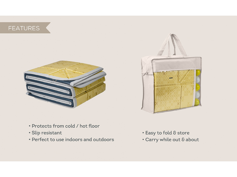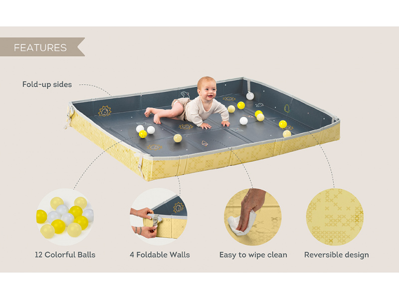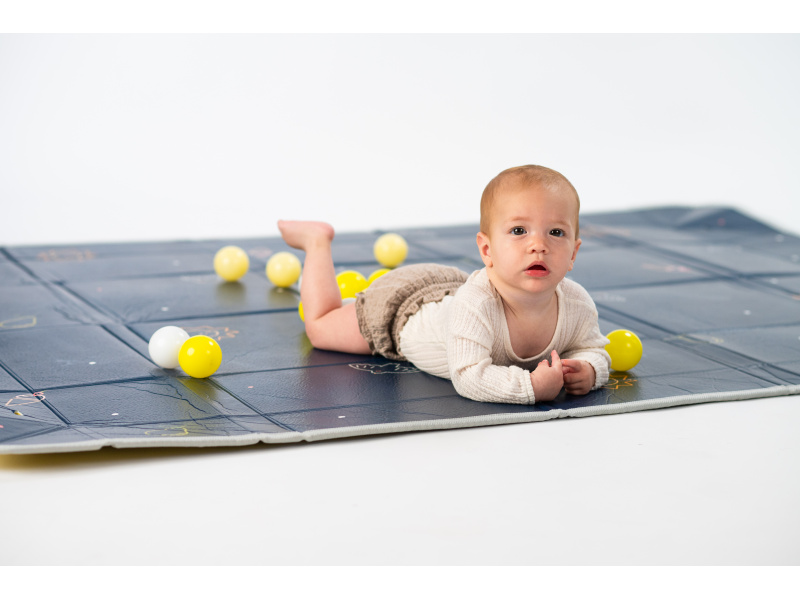 Extra velká, oboustranná pěnová hrací deka vyniká svou univerzálností a pohodlím pro vás i vaše dítě od narození. Jedinečné zvednuté okraje vytvářejí bezpečnou, uzavřenou hrací plochu, udržují hračky a míčky na dece a poskytují miminku pocit bezpečí. Starším dětem okraje snadno položíte, abyste maximalizovali plochu na hraní. rozměr 150 x 180 cm s možností složení do kompaktního rozměru pro přenášení i skladování (taška na zip je součástí balení) měkké provedení s voděodolným povrchem pro použití doma i venku oboustranné provedení s krásným potiskem součástí balení je 12 barevných míčků Materiál, ze kterého je hrací podložka vyrobena, je zcela bezpečný pro zdraví vašeho dítěte a neobsahuje BPA, PVC, olovo, ftaláty ani rtuť. Snadná údržba otřením. Vhodné pro děti od narození.