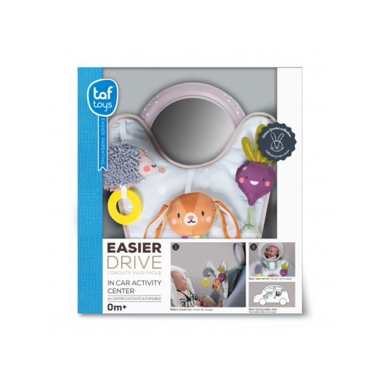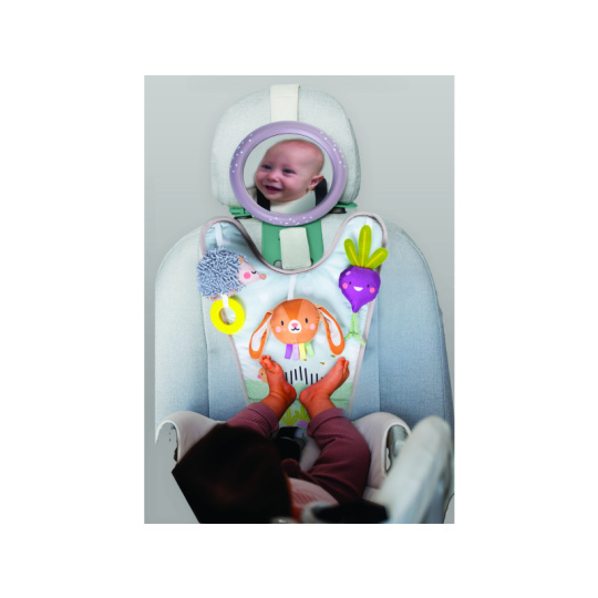 Hrací pultík se zavěšenými textilními hračkami a krásnými ilustracemi ze života na zahradě zabaví během jízdy dítě sedící v autosedačce proti směru jízdy. Velké zpětné zrcátko umožňuje rodiči dítě sledovat během jízdy. Pultík nabízí ke zkoumání chrasticího králíčka, šusticí řepu a cinkajícího ježka. Snadné připevnění do auta s pomocí suchého zipu. Hrací pultík a zpětné zrcátko lze používat i samostatně. Pro děti od narození.