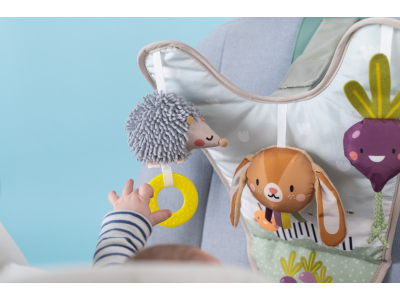 Hrací pultík se zavěšenými textilními hračkami a krásnými ilustracemi ze života na zahradě zabaví během jízdy dítě sedící v autosedačce proti směru jízdy. Velké zpětné zrcátko umožňuje rodiči dítě sledovat během jízdy. Pultík nabízí ke zkoumání chrasticího králíčka, šusticí řepu a cinkajícího ježka. Snadné připevnění do auta s pomocí suchého zipu. Hrací pultík a zpětné zrcátko lze používat i samostatně. Pro děti od narození.