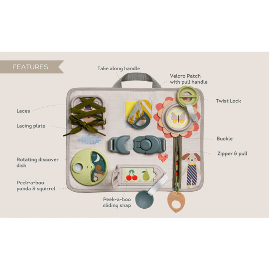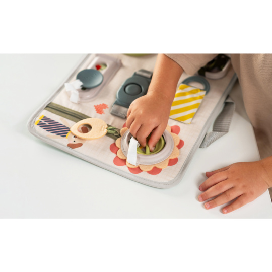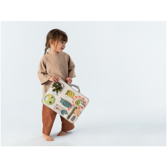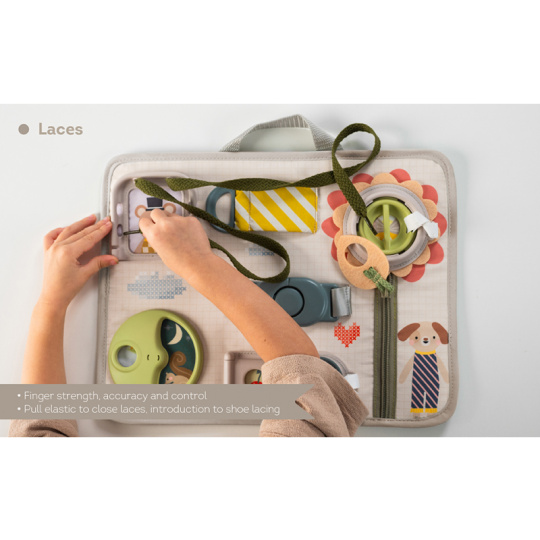 Originální hrací pult nabízí množství různorodých aktivit, mezi kterými najdete zip, velký knoflík, suché zipy tkaničky, přezku, poutko a mnoho dalšího. Zapínáním a rozepínáním si děti procvičují jemnou motoriku i koordinaci oko-ruka. Aktivity zároveň podporují rozvoj kreativity dítěte i jeho schopnosti řešit problémy. Hrací pult byl speciálně navržen pro děti od 18 měsíců. Rozměry: 34 x 25 cm