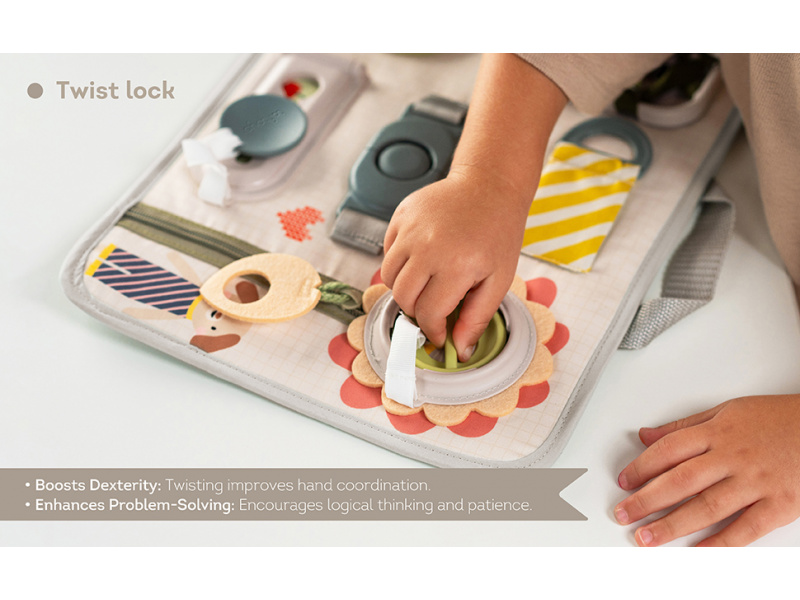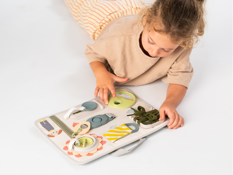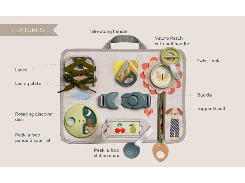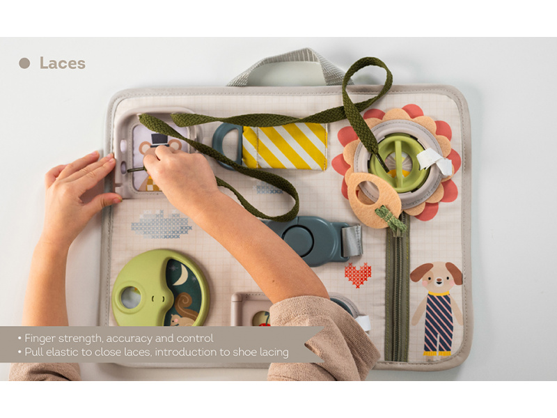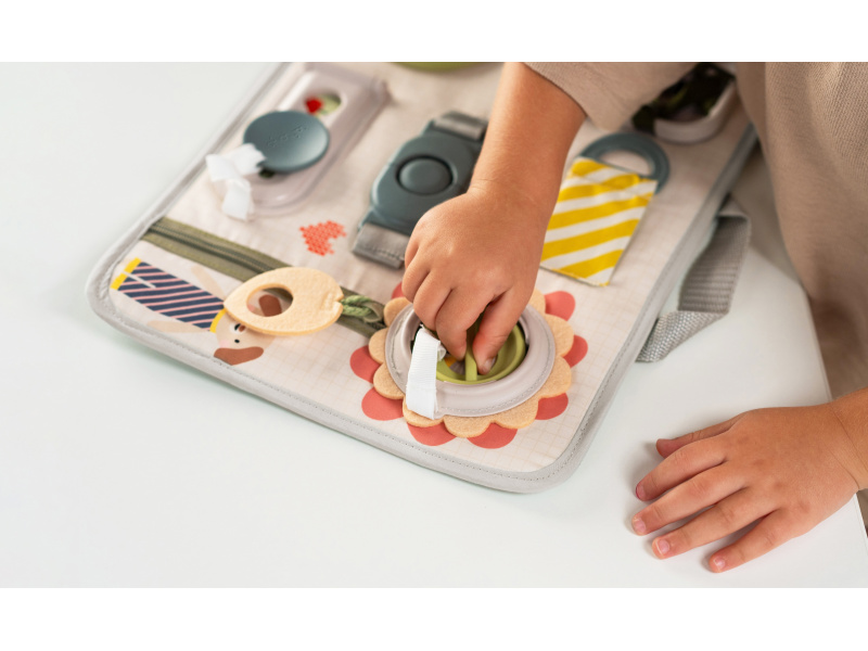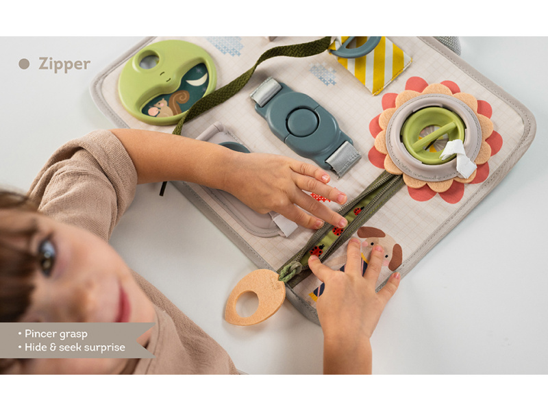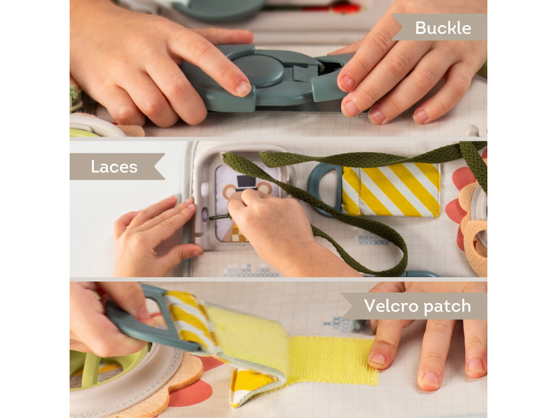 Originální hrací pult nabízí množství různorodých aktivit, mezi kterými najdete zip, velký knoflík, suché zipy tkaničky, přezku, poutko a mnoho dalšího. Zapínáním a rozepínáním si děti procvičují jemnou motoriku i koordinaci oko-ruka. Aktivity zároveň podporují rozvoj kreativity dítěte i jeho schopnosti řešit problémy. Hrací pult byl speciálně navržen pro děti od 18 měsíců. Rozměry: 34 x 25 cm