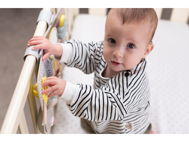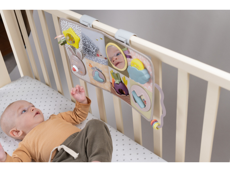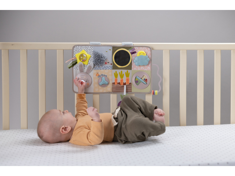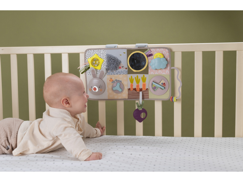 Interaktivní hrací pult s hudbou, světýlky a krásnými motivy ze života na zahradě nabízí 13 různorodých aktivit pro 3 věková stádia dítěte. Dětem od narození jej s pomocí úchytů zavěsíte na postýlku Od 3 měsíců pultík pomůže zabavit dítě při pro hraní na bříšku na hrací dece Od cca 8 měsíců dítě pultík využije k samostatné hře vsedě Na hracím pultu najdete králíčka s hudbou a světýlky, schovávací hry, chrasticí průhledný míček s korálky, šusticí části, kousátka, pohyblivé kroužky, otočná kolečka a další aktivity a textury ke zkoumání. Hraní s různorodými aktivitami podporuje rozvoj jednotlivých smyslů dítěte a jeho jemné a hrubé motoriky. Baterie 3x AAA nejsou součástí. Vhodné pro děti od narození.
