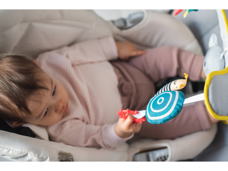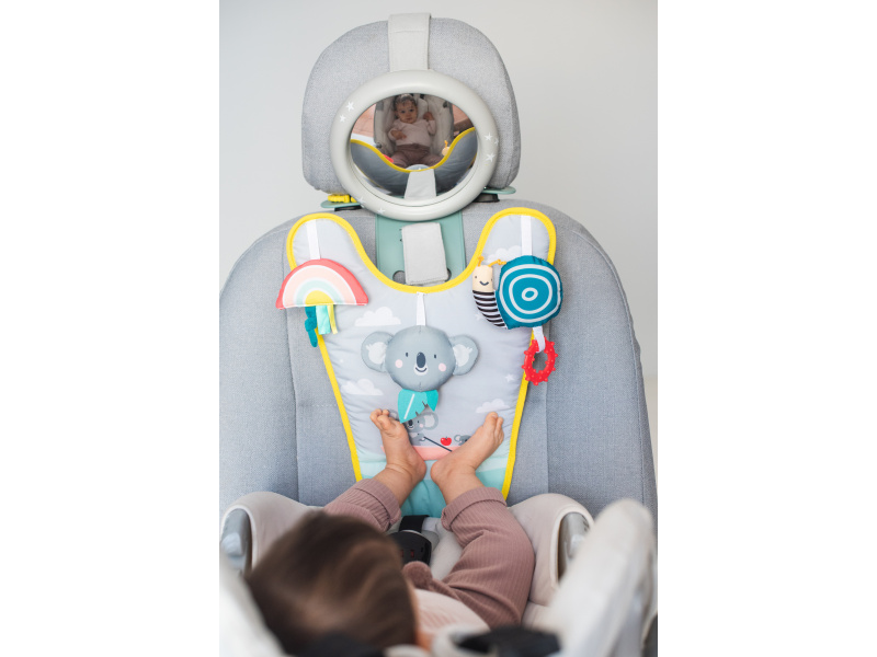 Hrací pultík se zavěšenými hračkami zabaví během jízdy dítě sedící v autosedačce proti směru jízdy. Zpětné zrcátko umožňuje rodiči dítě sledovat během jízdy. Pultík nabízí ke zkoumání chrasticího medvídka koalu, šusticí duhu a cinkajícího šnečka s kousátkem. Snadné připevnění s pomocí suchého zipu. Hrací pultík a zpětné zrcátko lze používat i samostatně. Pro děti od narození.