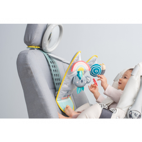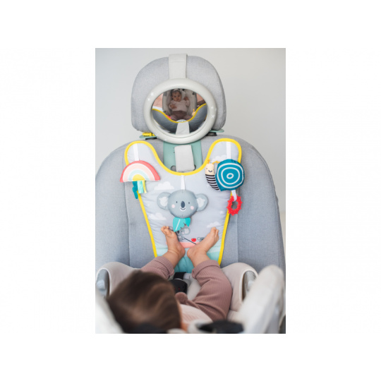 Hrací pultík se zavěšenými hračkami zabaví během jízdy dítě sedící v autosedačce proti směru jízdy. Zpětné zrcátko umožňuje rodiči dítě sledovat během jízdy. Pultík nabízí ke zkoumání chrasticího medvídka koalu, šusticí duhu a cinkajícího šnečka s kousátkem. Snadné připevnění s pomocí suchého zipu. Hrací pultík a zpětné zrcátko lze používat i samostatně. Pro děti od narození.