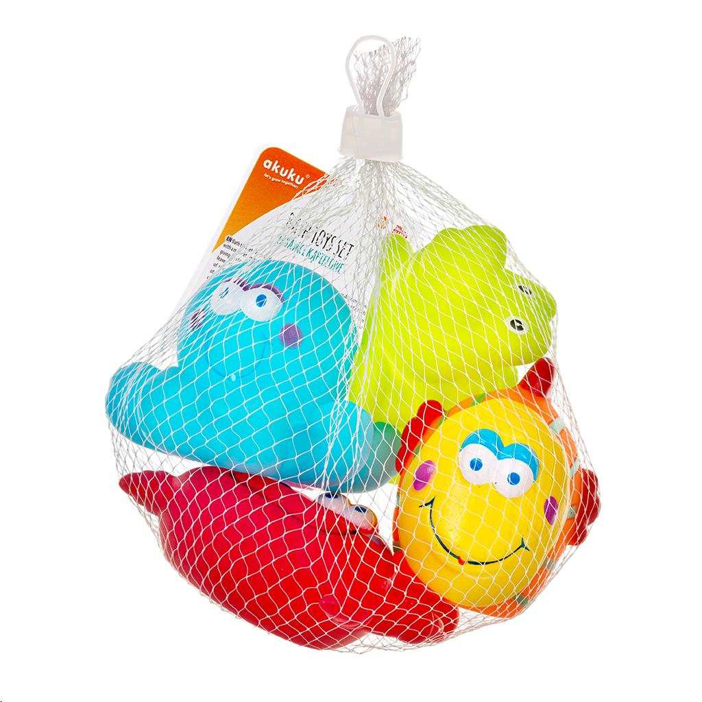 Barevné hračky do koupele Akuku. Sada 4 roztomilých barevných hraček - rybička, želvička, krab, chobotnice. Ideální na hraní ve vaně. Veselé barvy přitahnou pozornost našich nejmenších. Každá hračka má otvor, kterým můžete stříkat vodu. Zaoblené tvary zaručují bezpečnost během hry. Vyrobeny z bezpečných, vysoce kvalitních materiálů, neobsahují bisfenol A. Výška hraček 4 až 6 cm.