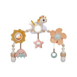 Hrazda Tiny Love Unicorn Wonderlands v jemných pastelových barvách s pohádkovým motivem jednorožce je vhodná na kočárek, autosedačku či lehátko. Nabízí množství aktivit pro zabavení dítěte na cestách i doma, např. chrastítko, kousátko, otáčecí větrník nebo bezpečné zrcátko. Hrazda nabízí dva způsoby použití pro dvě vývojová stádia dítěte: Od narození: zavěšené jemně chrasticí a pohybující se hračky upoutají pozornost ležícího dítěte. Od 5 měsíců: dítě začíná hračky aktivně tahat a zkoumat rukama. Hrazda dítě nejen zabaví, ale současně rozvíjí rozvíjí jeho jednotlivé smysly a motorické dovednosti. Hrazdu snadno připevníte s pomocí plastových klipsů k většině kočárků i autosedaček. Klouby umožňují nastavit sklon hrazdy dle potřeby. Vhodné pro děti od narození.