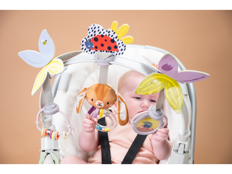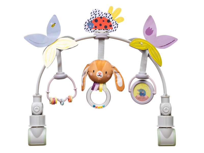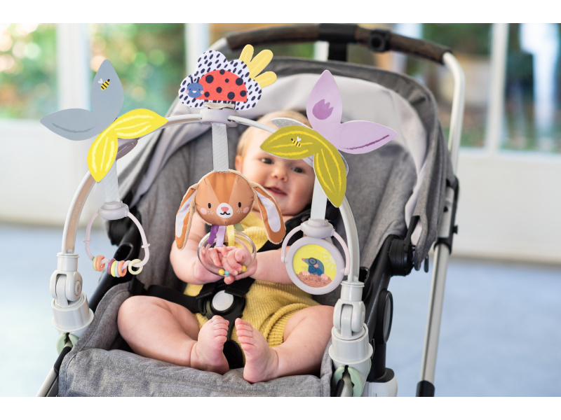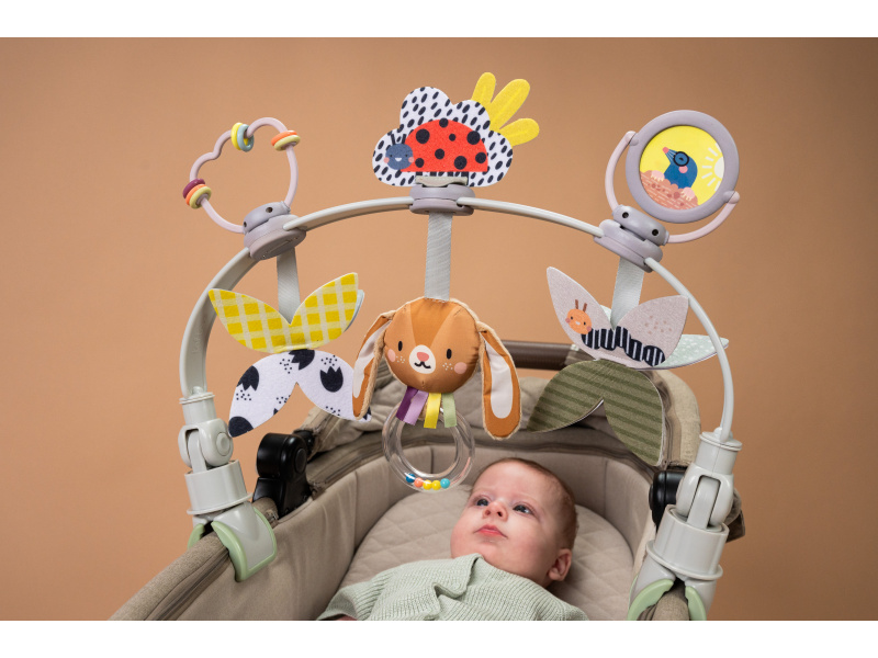 Hrazda je určena k připevnění na kočárek nebo autosedačku a zabaví vaše miminko na cestách. Hrazda nabízí dva způsoby použití pro dvě vývojová stádia dítěte: Od narození: zavěšení motýli s černobílými a barevnými, vysoce kontrastními křídly upoutají pozornost dítěte a stimulují rozvoj jeho zraku Od 3 měsíců: chrastítko s korálky, chrastítko králíček se šusticíma ušima a otočná hračka se zrcátkem a pohyblivým obrázkem lákají dítě ke zkoumána rukama Hrazda dítě nejen zabaví, ale současně rozvíjí rozvíjí jeho jednotlivé smysly a motorické dovednosti. Měkkou a pružnou hrazdu připevníte s pomocí plastových klipsů k většině kočárků i autosedaček. Klouby umožňují nastavit sklon hrazdy dle potřeby. Vhodné od narození.