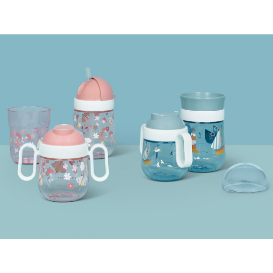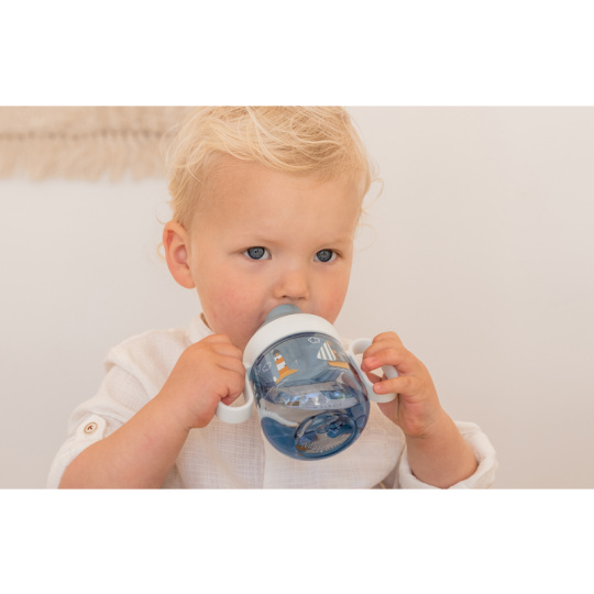 Hrnek s krásným potiskem má pítka na obou stranách, takže dítě může začít pít bez ohledu na to, ze které strany jej uchopí. Krátká pítka jsou doporučována pro zdravý výoj úst a zubů dítěte. Držadla umožňují snadné uchopení dětskými ručičkami. Víčko brání vytečení obsahu hrnku při přenášení. Hrnek je součástí designové kolekce hraček a doplňků pro děti Little Dutch Námořnický záliv. Objem: 200 ml Hrnek je snadné rozebrat a umýt v myčce. Materiál: PP, silikon, Tritan Vhodné pro děti od 6 měsíců.