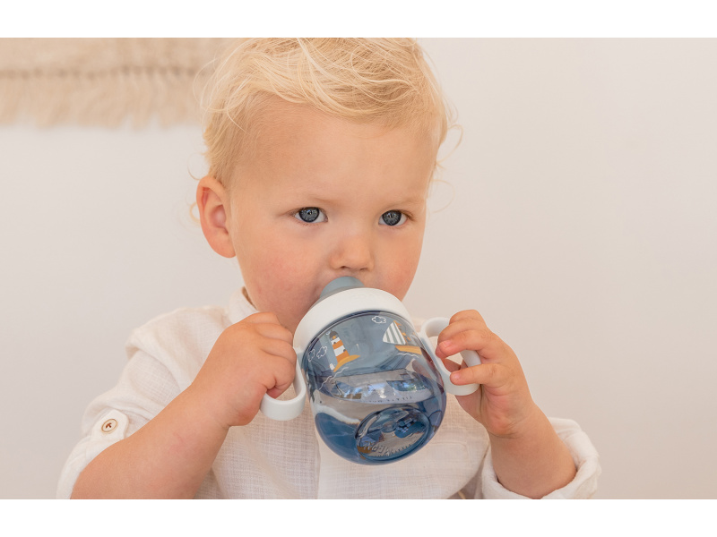 Hrnek s krásným potiskem má pítka na obou stranách, takže dítě může začít pít bez ohledu na to, ze které strany jej uchopí. Krátká pítka jsou doporučována pro zdravý výoj úst a zubů dítěte. Držadla umožňují snadné uchopení dětskými ručičkami. Víčko brání vytečení obsahu hrnku při přenášení. Hrnek je součástí designové kolekce hraček a doplňků pro děti Little Dutch Námořnický záliv. Objem: 200 ml Hrnek je snadné rozebrat a umýt v myčce. Materiál: PP, silikon, Tritan Vhodné pro děti od 6 měsíců.