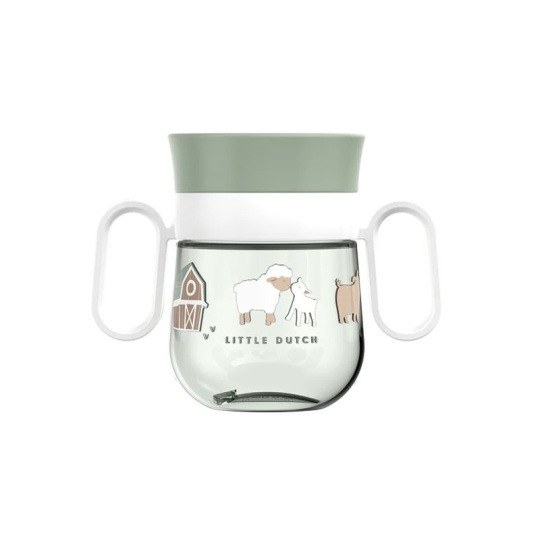 Trénovací hrnek je ideální pro děti, které se učí pít z klasického hrnku. Silikonové víčko se systémem 360° umožňuje pít z kteréhokoli místa po obvodu hrnku bez rizika rozlití. Tekutina teče z hrnku po naklonění k ústům dítěte kontrolovaným způsobem, takže dítě na sebe při pití obsah hnku nevylije. Když pít přestane, hrnek se díky speciální membráně automaticky uzavře. Držadla usnadňují držení hrnku malými dětskými ručičkami. Hrnek s krásným potiskem je součástí designové kolekce hraček a doplňků pro děti Little Dutch Farma. Hrnek je snadné rozebrat a umýt v myčce. Materiál: PP, silikon, Tritan Objem: 200 ml Vhodné pro děti od 6 měsíců.