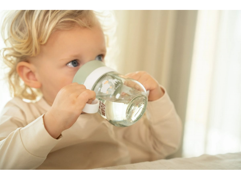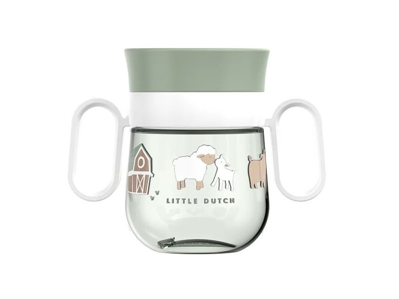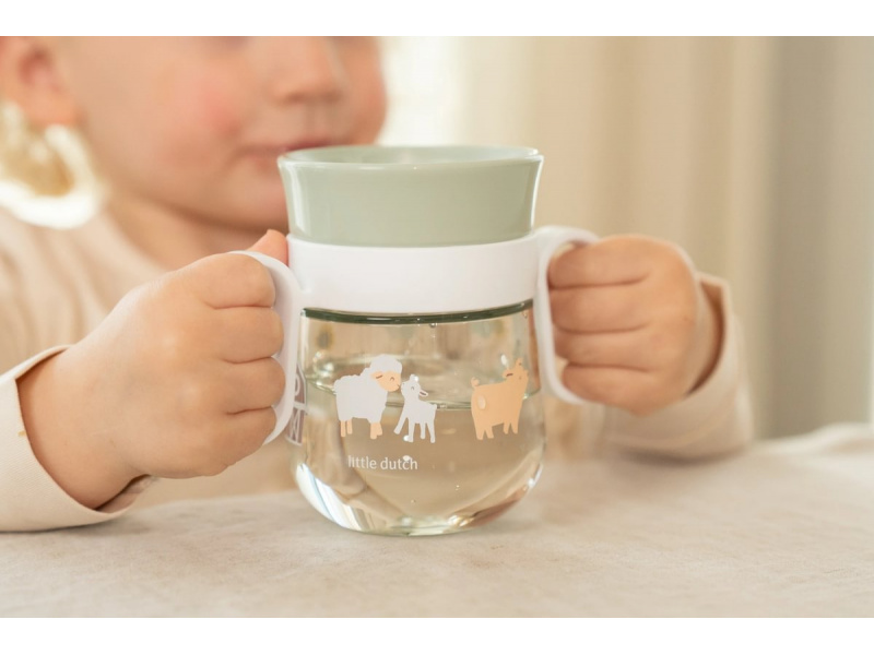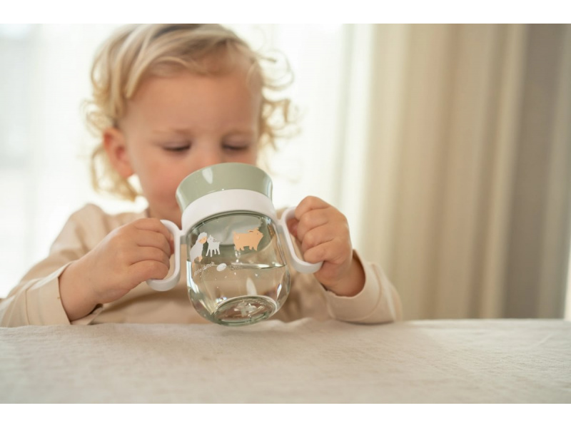 Trénovací hrnek je ideální pro děti, které se učí pít z klasického hrnku. Silikonové víčko se systémem 360° umožňuje pít z kteréhokoli místa po obvodu hrnku bez rizika rozlití. Tekutina teče z hrnku po naklonění k ústům dítěte kontrolovaným způsobem, takže dítě na sebe při pití obsah hnku nevylije. Když pít přestane, hrnek se díky speciální membráně automaticky uzavře. Držadla usnadňují držení hrnku malými dětskými ručičkami. Hrnek s krásným potiskem je součástí designové kolekce hraček a doplňků pro děti Little Dutch Farma. Hrnek je snadné rozebrat a umýt v myčce. Materiál: PP, silikon, Tritan Objem: 200 ml Vhodné pro děti od 6 měsíců.