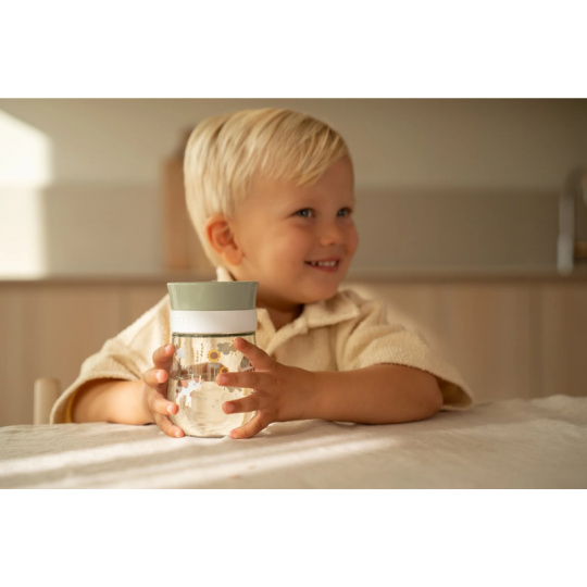 Trénovací hrnek je ideální pro děti, které se učí pít z klasického hrnku. Silikonové víčko se systémem 360° umožňuje pít z kteréhokoli místa po obvodu hrnku bez rizika rozlití. Tekutina teče z hrnku po naklonění k ústům dítěte kontrolovaným způsobem, takže dítě na sebe při pití obsah hnku nevylije. Když pít přestane, hrnek se díky speciální membráně automaticky uzavře. Hrnek s krásným potiskem je součástí designové kolekce hraček a doplňků pro děti Little Dutch Farma. Hrnek je snadné rozebrat a umýt v myčce. Materiál: PP, silikon, Tritan Objem: 300 ml Vhodné pro děti od 9 měsíců.