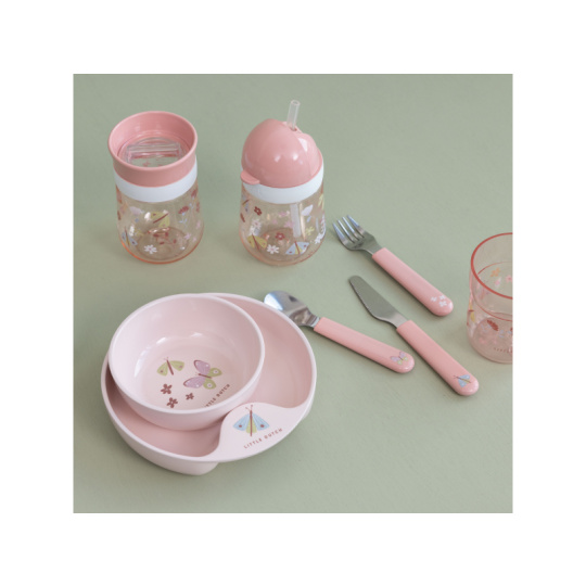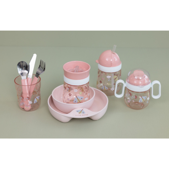 Trénovací hrnek je ideální pro děti, které se učí pít z klasického hrnku. Silikonové víčko se systémem 360° umožňuje pít z kteréhokoli místa po obvodu hrnku bez rizika rozlití. Tekutina teče z hrnku po naklonění k ústům dítěte kontrolovaným způsobem, takže dítě na sebe při pití obsah hnku nevylije. Víčko zároveň umožňuje uzavřít obsah hrnku pro bezpečné přenášení. Hrnek s krásným potiskem je součástí designové kolekce hraček a doplňků pro děti Little Dutch Květiny a motýli. Hrnek je snadné rozebrat a umýt v myčce. Materiál: PP, silikon, Tritan Objem: 300 ml Vhodné pro děti od 9 měsíců.