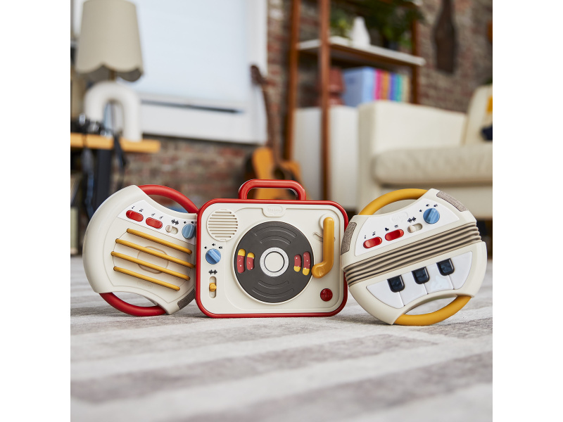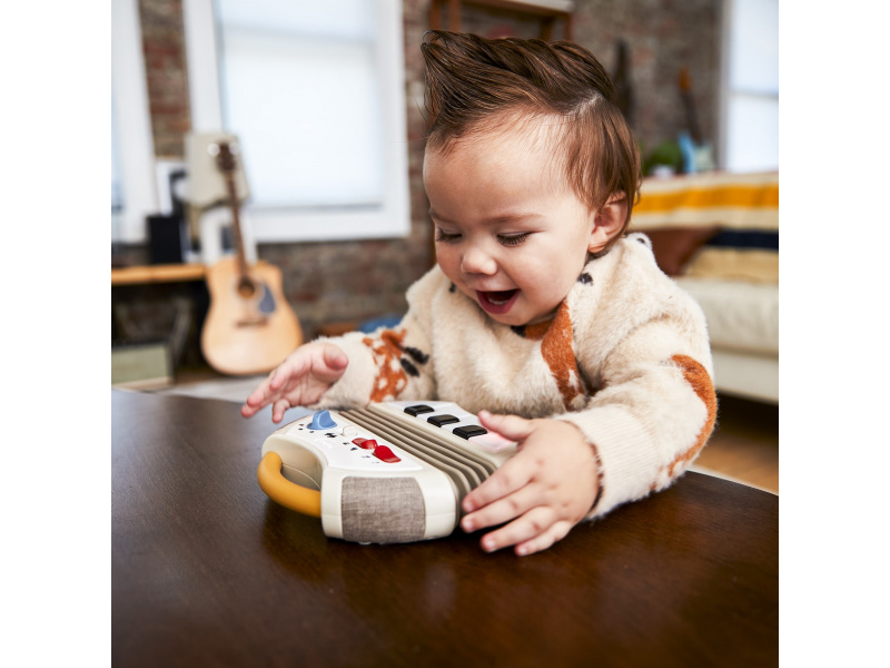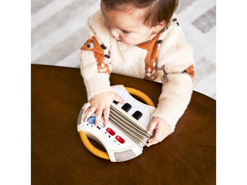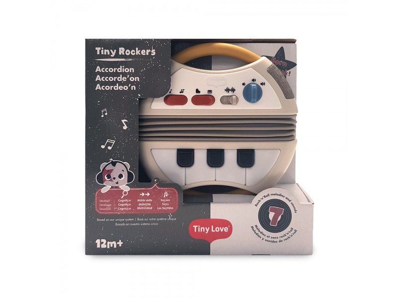 Hudební akordeon Tiny Love je originální hračka, která zábavným způsobem pomáhá rozvíjet emoce a kreativitu vašeho dítěte. Hračka nabízí 7 rockových melodií a umožňuje dítěti poslouchat hudbu nebo vytvářet melodie vlastní. Každá ze sedmi kláves produkuje jiné zvuky, navíc lze přepínat mezi klasickými nebo elektronickými zvuky. Barevná LED světla pomáhají rozlišit klávesy. Otevírání a zavírání harmoniky rovněž vytváří zvuky. Hračka s kvalitním reproduktorem je vybavena možností vypnutí a nabízí 3 úrovně hlasitosti. Hudební akordeon je vhodný pro samostatnou hru ale i pro hraní rodičů s dítětem. Společné hraní na akordeon, zpívání a tancování je je skvělý způsob, jak si užít vzácný čas s vaším dítětem! Díky kompaktním rozměrům a držadlům je hračka vhodná na doma i na cesty. Baterie 2xAA nejsou součástí výrobku. Rozměry: 18 x 18 x 5 cm Vhodné pro děti od 12 měsíců.